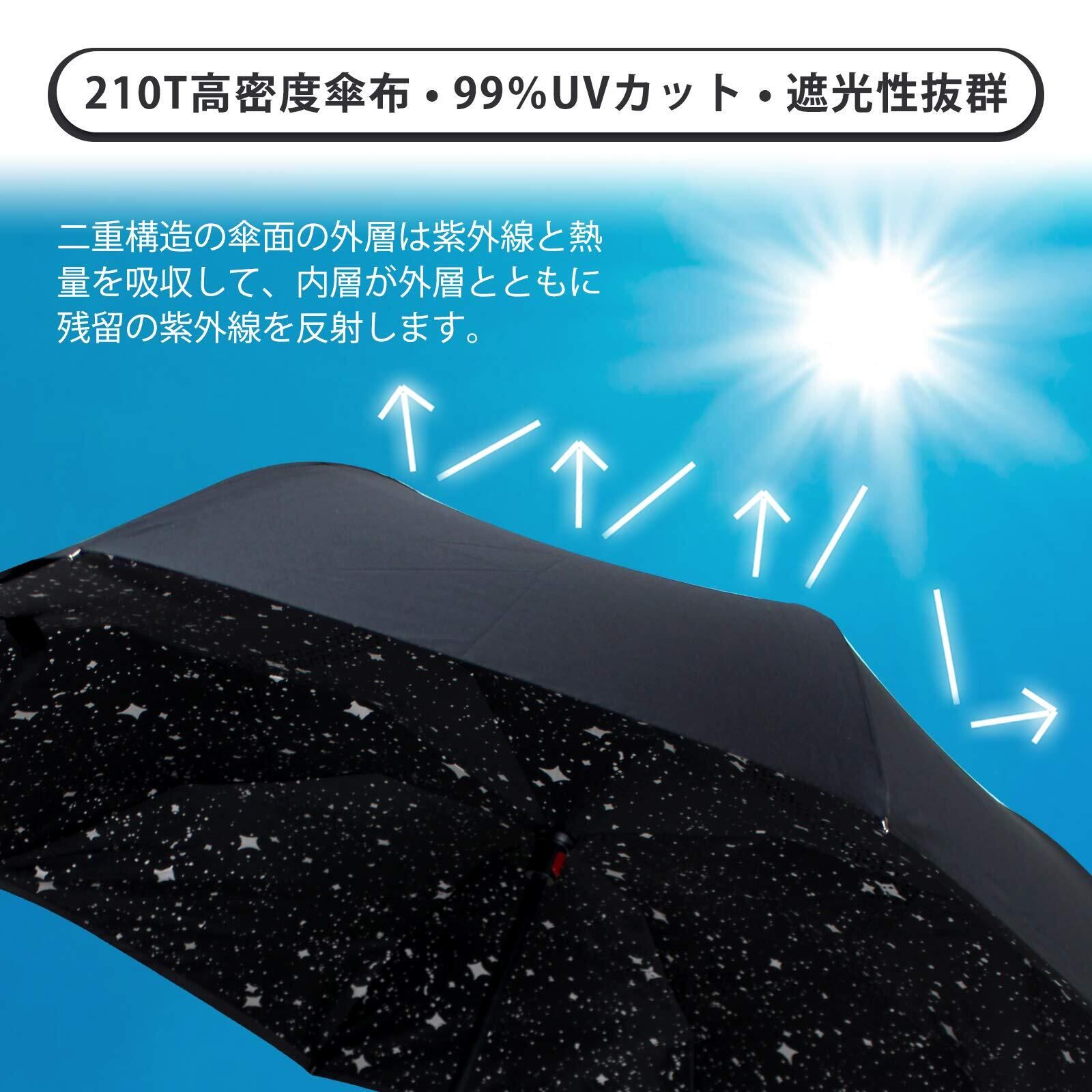 【内外2枚の布で構成撥水性抜群な晴雨兼用傘】丈夫な内外2枚の布で構成されてのため、UVカット効果と耐風機能更にアップです。傘が風の抵抗が強く、裏返る事もないです。高密度布地で撥水機能もバッチリ。