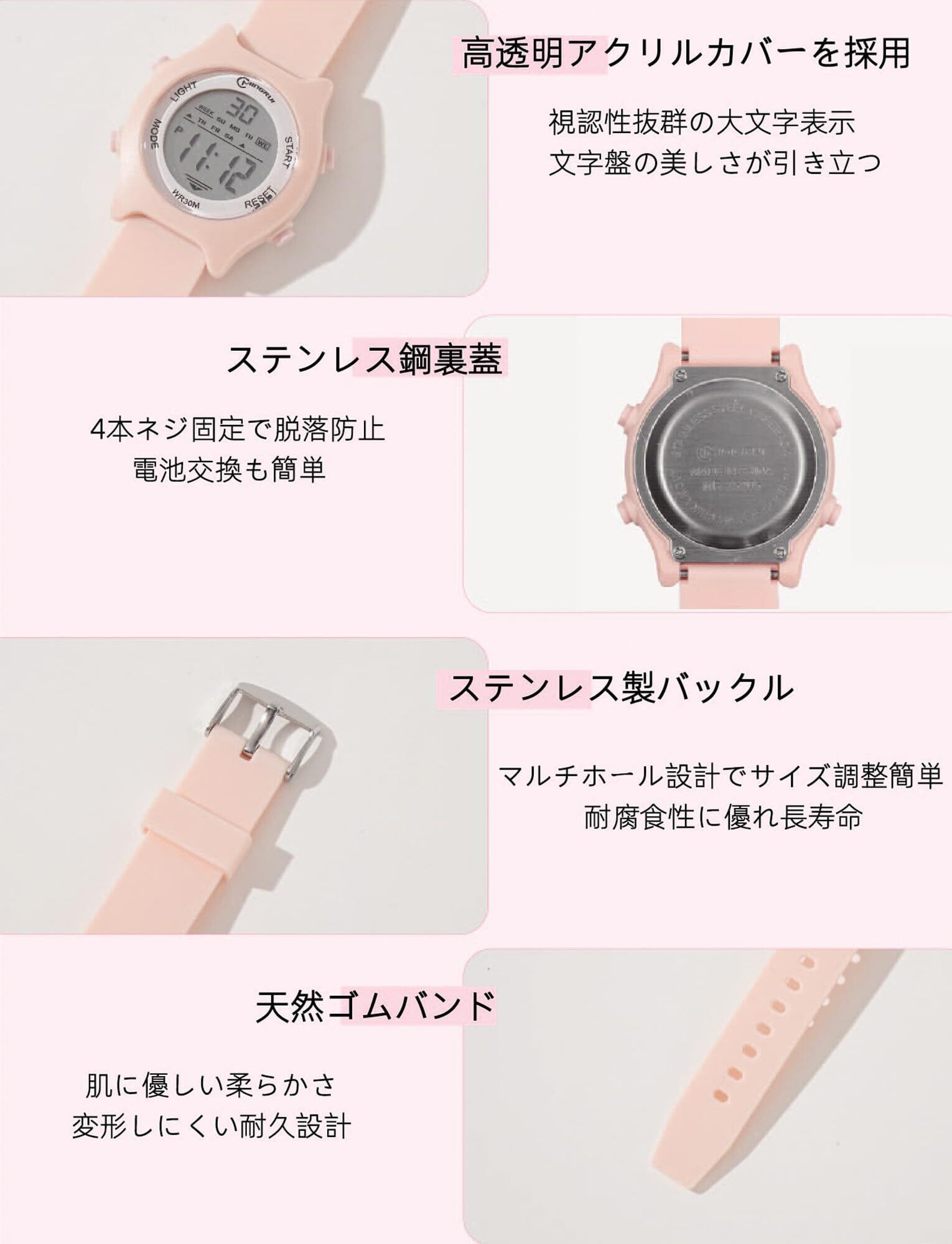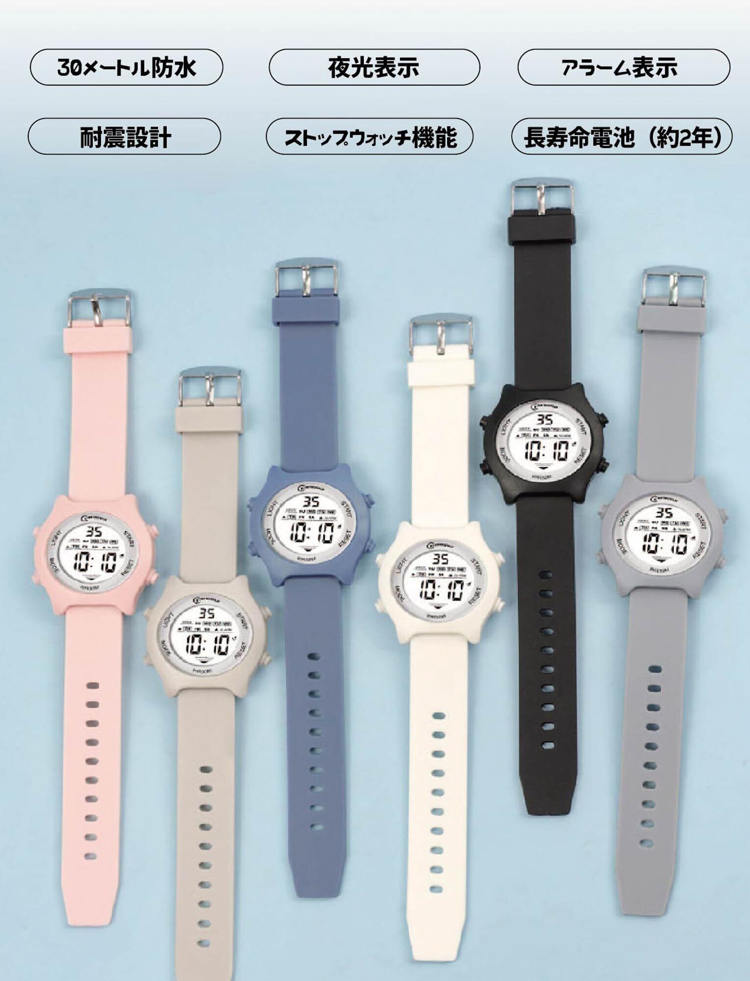 時刻・日付・曜日表示に加え、ストップウォッチ・アラーム・LEDバックライトなど便利な機能が満載!日常生活はもちろん、勉強やトレーニングの時間管理にも活躍します。