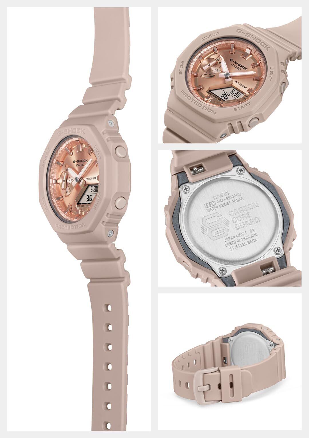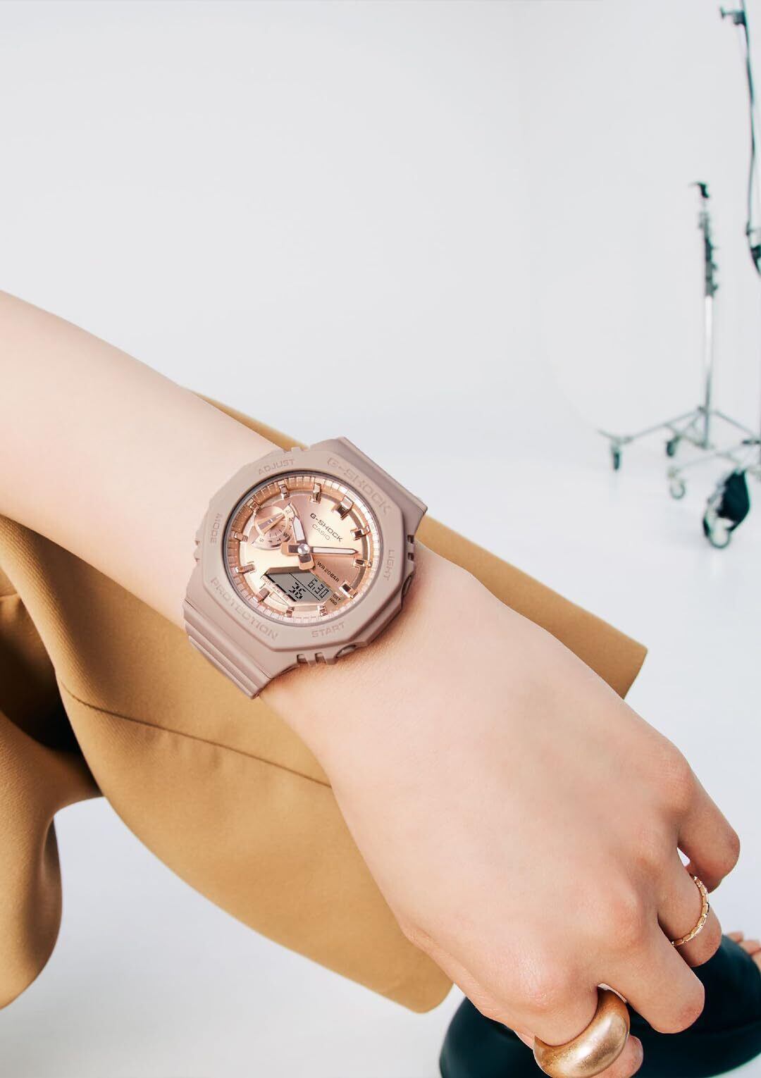 レディース向けG-SHOCK: 人気のデジタル・アナログコンビモデル、GMA-S2100シリーズからピンクゴールドの蒸着文字板が輝くモデルの紹介です。