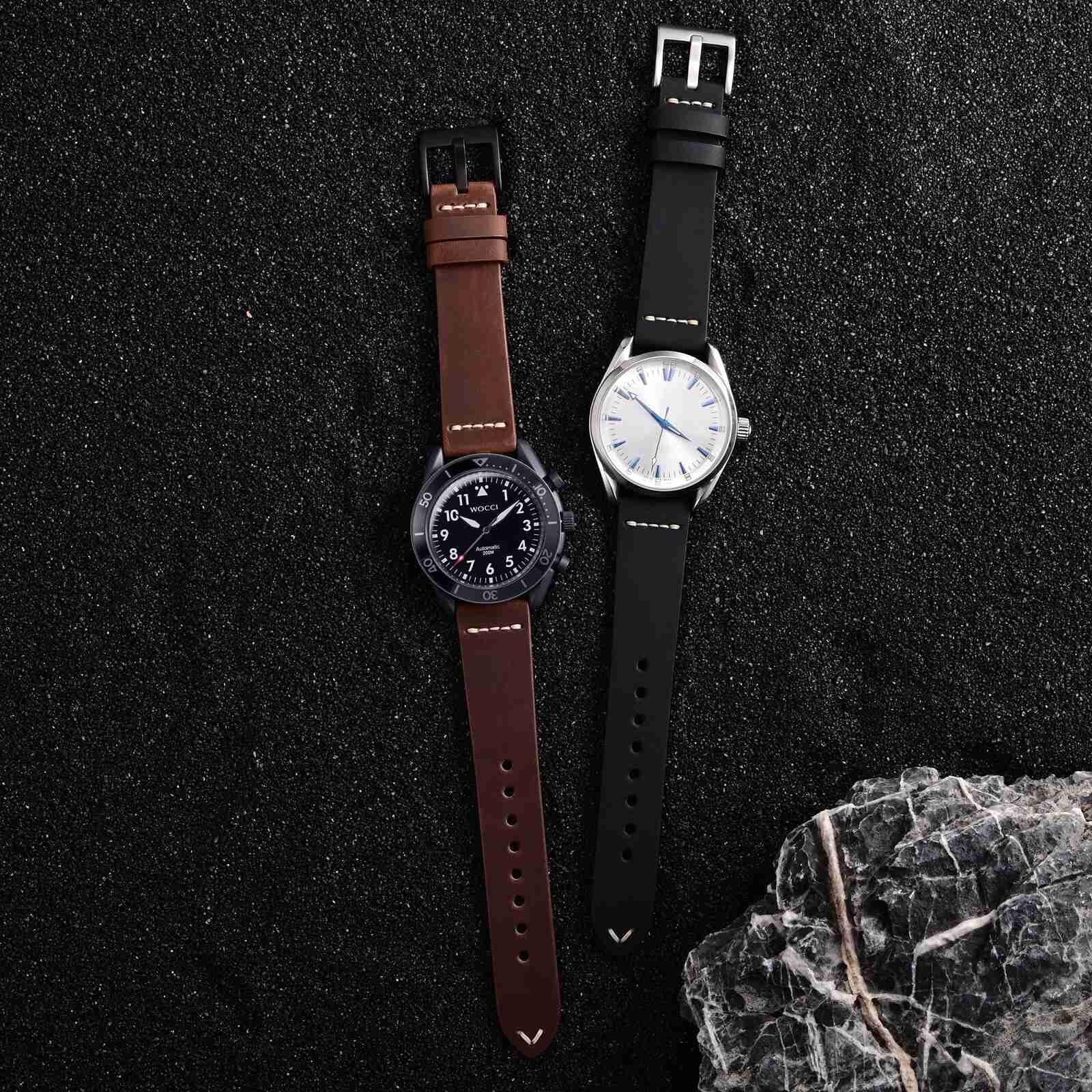 ステッチはすべてフレンチワックス糸を使用し、手作業で縫製されています。時計バンドの耐久性を高めながらヴィンテージな外観を与え、パイロットウォッチやスポーツウォッチに最適です。