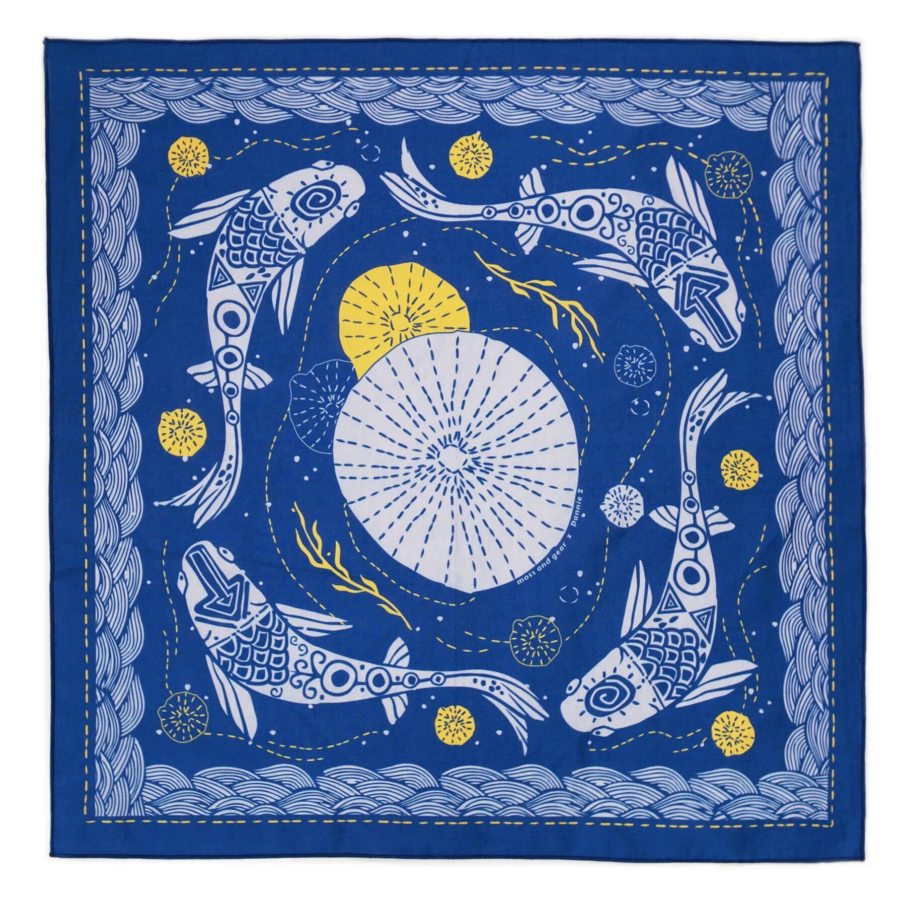 この鮮やかなブルーのバンダナは、高品質なプレミアムコットン100%を使用し、しっかりと織られた柔らかな肌触りが特徴です。敏感肌の方にも安心して使え、アウトドアやキャンプ、日常のおしゃれにもぴったり。子どもから大人までユニセックスで使える万能アイテムです。 22インチ(約55cm)の大判サイズには、東洋の伝統的な錦鯉48種類を、名前付きのイラストで手描き風にデザイン。釣り好きな方や和柄ファンに喜ばれるアート性の高い一枚です。 南カリフォルニアで愛を込めてデザインされたこのバンダナは、**夏祭り、盆踊り、父の日のギフトや、釣り・キャンプなどアウトドアの相棒としても活躍**。バンダナキャップとして頭に巻いたり、風呂敷として使ったりと、多彩な使い方が可能です。