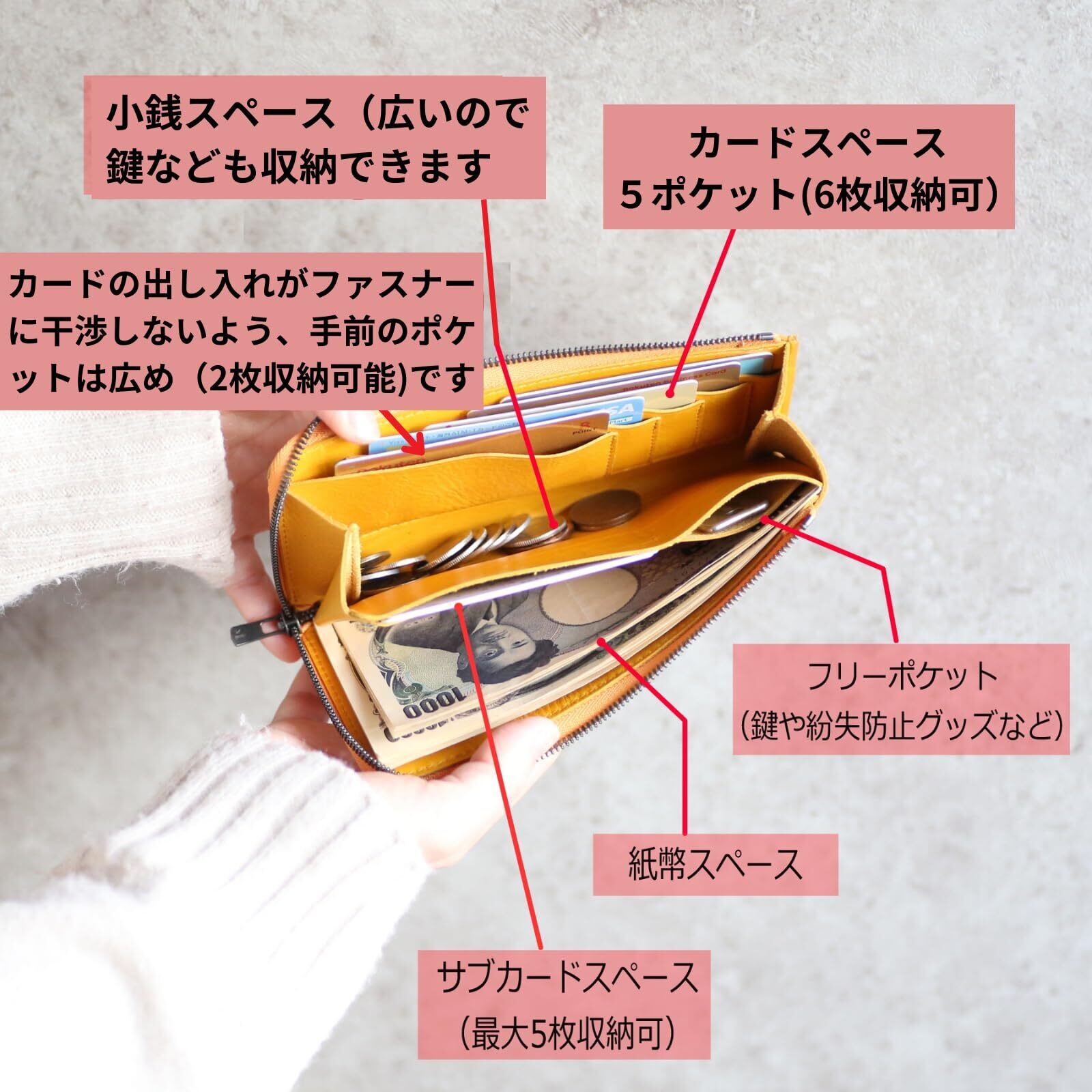 メインカードポケットの一番手前のポケットは、ファスナーとの干渉を考慮し、長めのポケット(2枚収納可)となっております。サブカードポケットは4~5枚収納可能です(個体差があり、革が馴染むまではキツく感じられる場合がございます)。