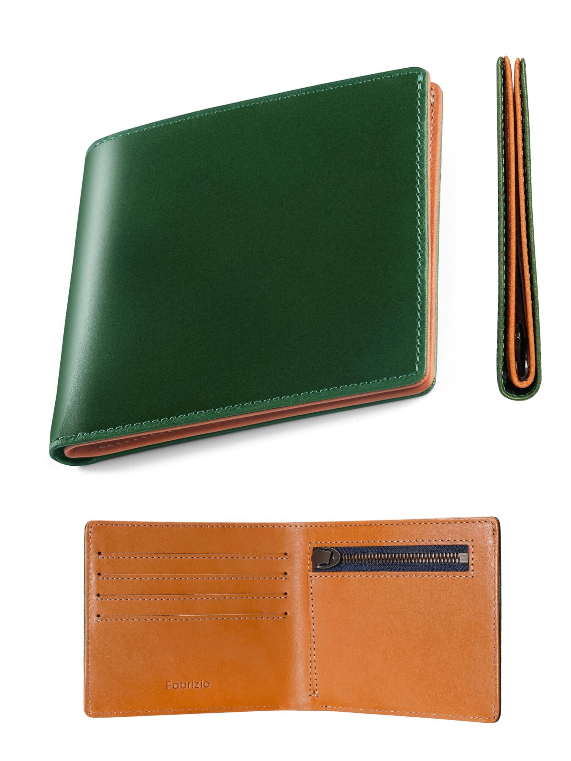 【特価セール】[ファブリツィオ] 極薄 財布 メンズ レディース 2つ折り 薄い 小銭入れ 使いやすい イタリアン レザー 一流の革職人が作る 本革 YKKファスナー(グリーン)