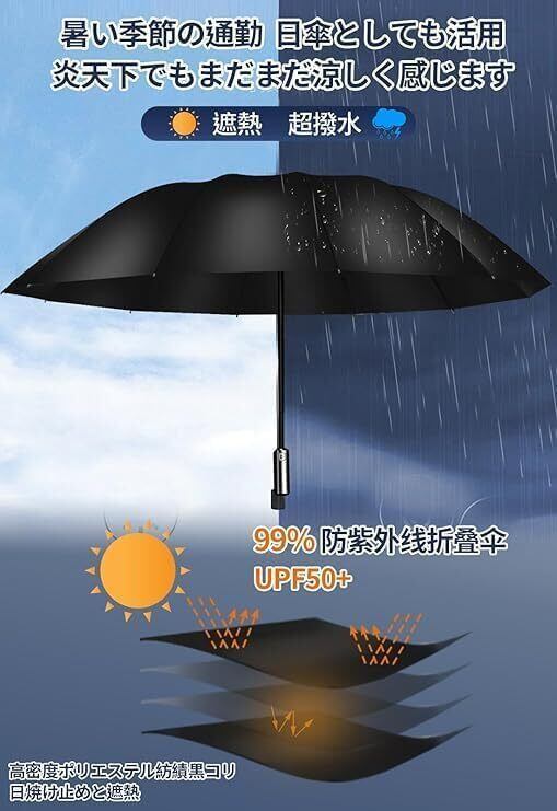 【105cmの広々傘面、二人がも余裕】この折り畳み傘は、開径105cm・リブ長110cmの男性向け大型仕様です。大人二人が並んで入れる広さで、大柄な男性もゆったりと雨宿り可能。畳んだ際の収納サイズは31cmとコンパクトで、通勤バッグや車内にもすっきり収まり、急な雨もしっかり防ぎます。