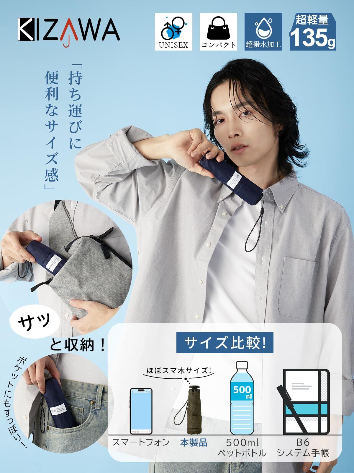 【スマホより軽い135g・手のひらサイズ16.5cm】驚きのコンパクトさと“持っているのを忘れる”軽さが魅力のポケット傘。重さはわずか135g、収納時は16.5cm。スマホより軽く、500mLペットボトルの約1/4の重さで、毎日の携帯にもストレスなし。バッグやポーチにすっぽり収まり、突然の雨にもこれ1本で安心です。幅広バンド付きでくるっと巻いて簡単に留められ、急いでいる時もスムーズに収納可能。デザインには、控えめなチェック柄を採用。落ち着いた印象でビジネスからカジュアルまで幅広く活躍。全長約51cm、親骨50cm、直径約89cm。通勤・通学はもちろん、旅行やフェスの“もしも雨”にも安心。軽さと携帯性、そしてしっかり雨をしのぐサイズ感を兼ね備えた、バッグ常備の新定番です。