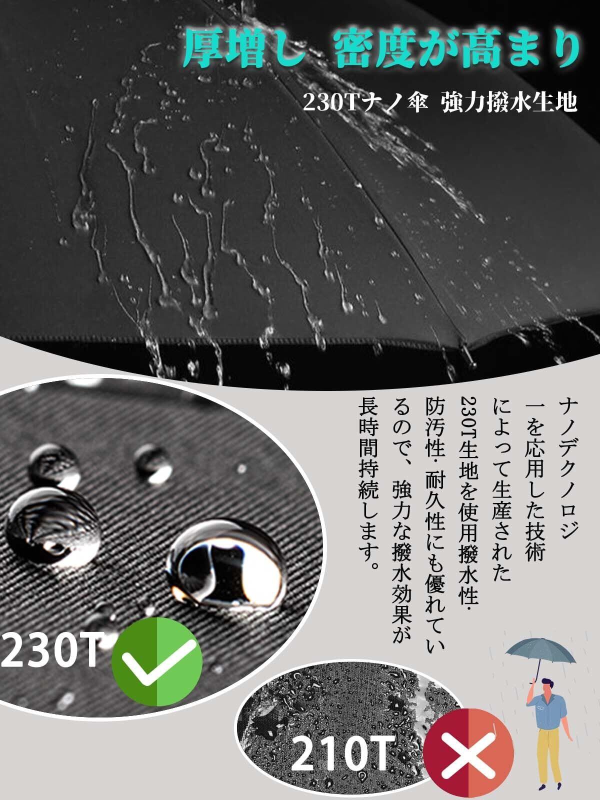 230t撥水加工まで大突破:高密度で防水性の高いの230T防水布地を採用されたことにより、撥水性に優れています。水滴が傘に落ちた瞬間に水玉になりコロコロと滑り落ちていきます。また、汚れ防止の効果も有り、汚れには強い生地となります。丈夫な傘骨に合わせて激しい暴風雨にも対抗でき、水漏れや強風による割れなどの心配が全然有りません。長い間使えます。