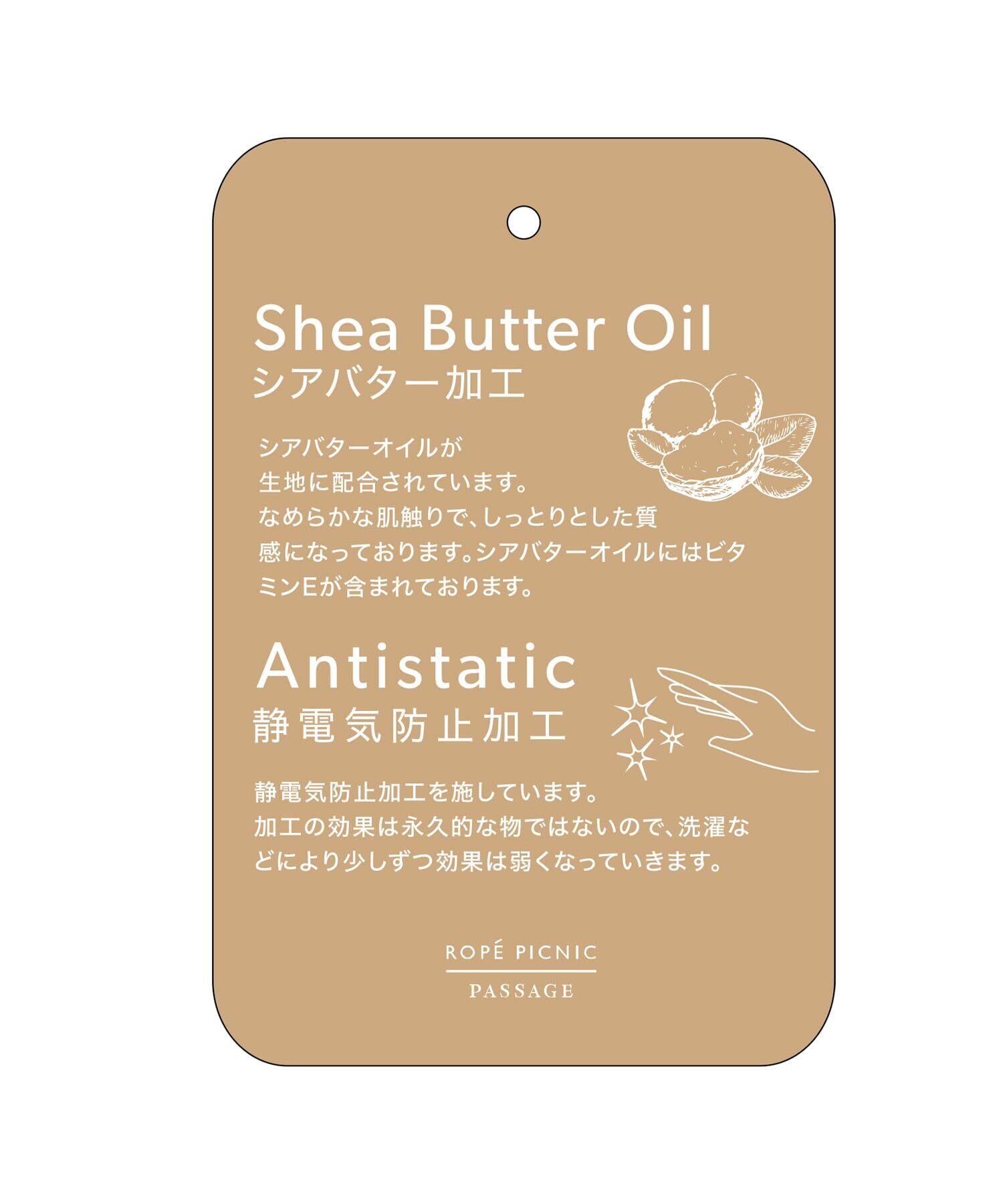 素材感 : シアの木の実から抽出した「シアバター」を、生地や製品へ浸透定着させる後加工を施しているので、しっとり滑らかな肌触り。寒い日に適した静電気防止加工。