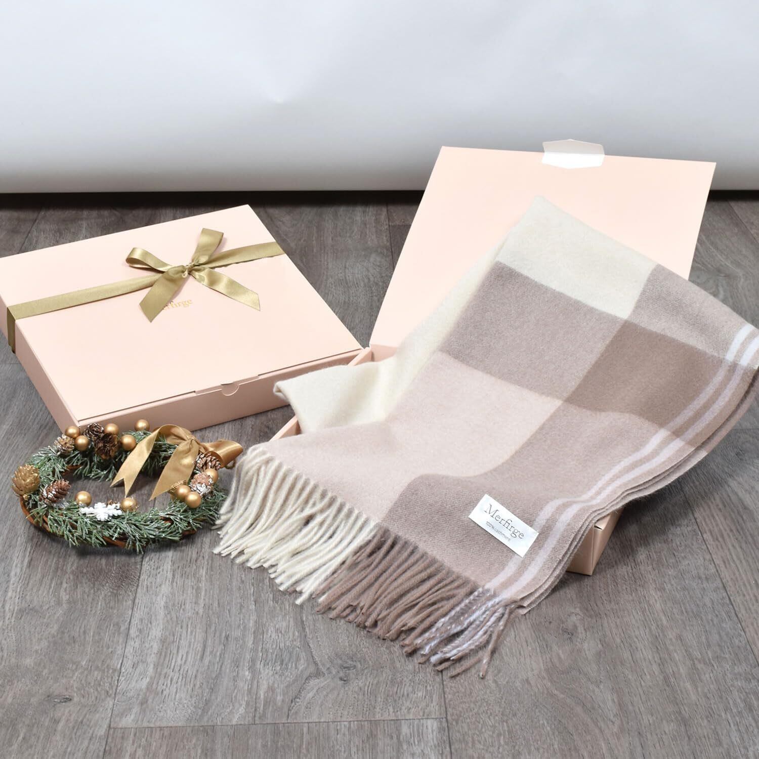 [Merfirge] カシミヤ100% ストール 【ラッピング済】【ギフトボックス付】 チェック柄 大判 厚手(CS1066)