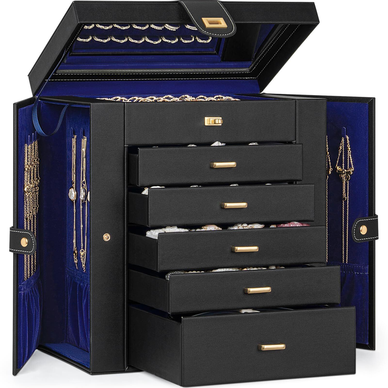 AKOZLIN 大容量 ジュエリーボックス 6段式 アクセサリー 収納 鏡付き 5段引き出し 小物入れ ネックレス ピアス 指輪 イヤリング 腕時計 収納 XL-30×17×32cm ブラック&ブルー