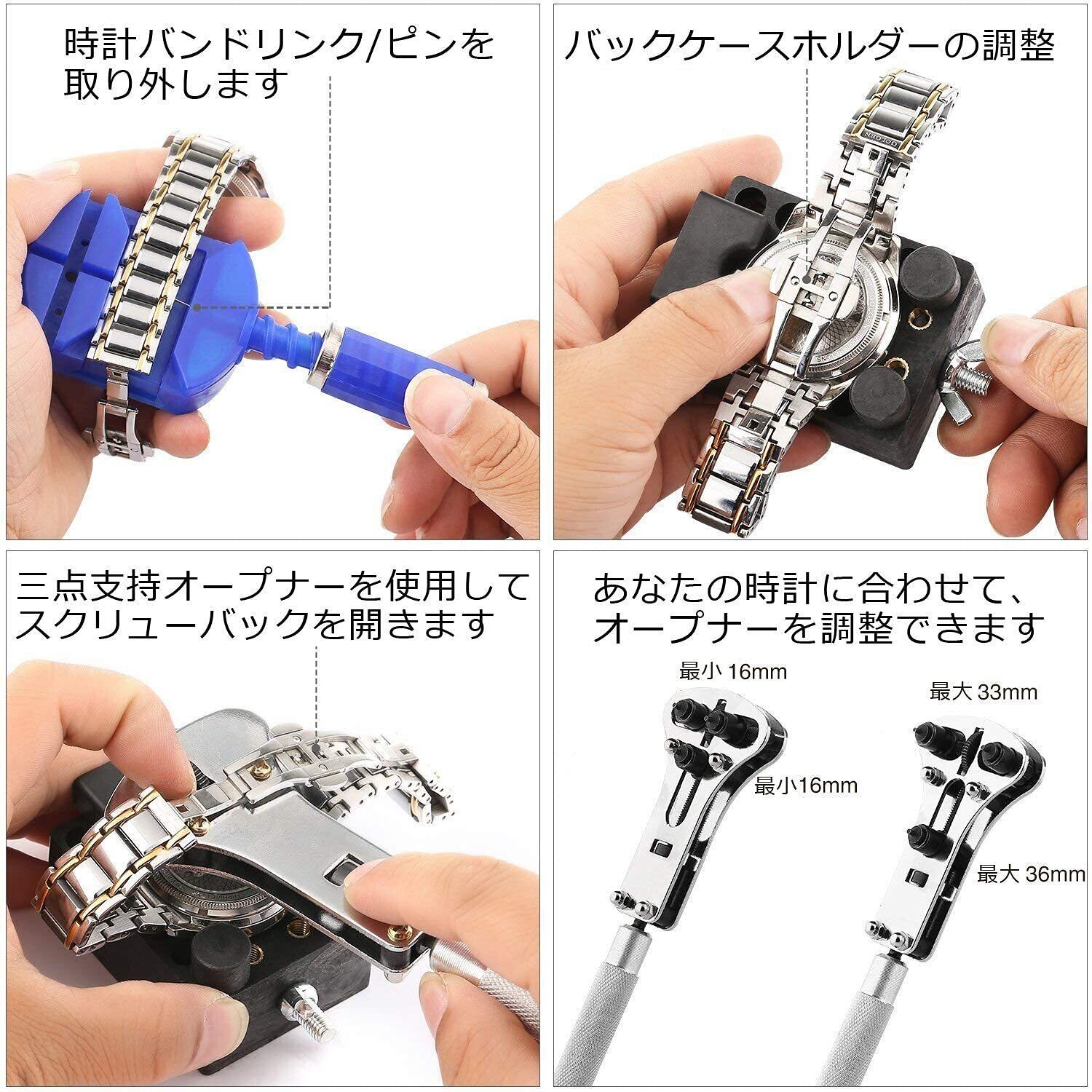 【腕時計工具 セット内容】時計工具 金属ハンマー、バンドピン抜き棒x3(0.8mm/0.9mm/1.0mm)、腕時計修理の精密ドライバー(1.0、1.2、1.6mm)、バネ外棒、バネ外器、バネ外器交換用ビットx7、腕時計交換用ウォッチピン(バネ棒)(2.8cm~1.0cm)、腕時計ホルダー、裏蓋開け器、腕時計三点支持オープナー、腕時計三点支持オープナー替えビットx18、オープナーナイフ、ステンレス製ピンセット、収納ケース付き。