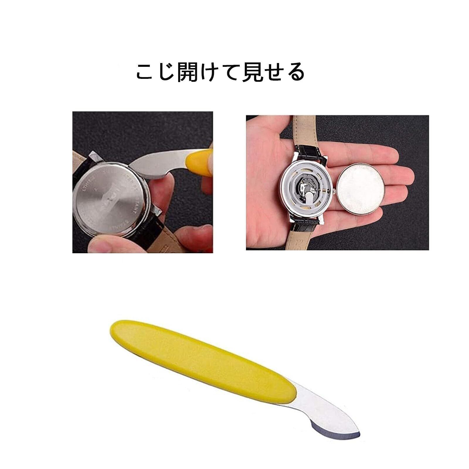 【使いやすい】使い方は簡単で裏蓋の溝にスッと差込み開くだけ!1.こじ口の位置を見つけます。2.ツールをこじ開けて選択します。3.力を入れてこじ開ける。5種類セットなので様々な腕時計に対応しています。幅広い腕時計に対応します、腕時計の裏蓋を外す際に必要となる専用工具です。精度とリーズナブルなデザイン時計を傷つけずに高効率。ご自身で電池交換をされる際に重宝します。