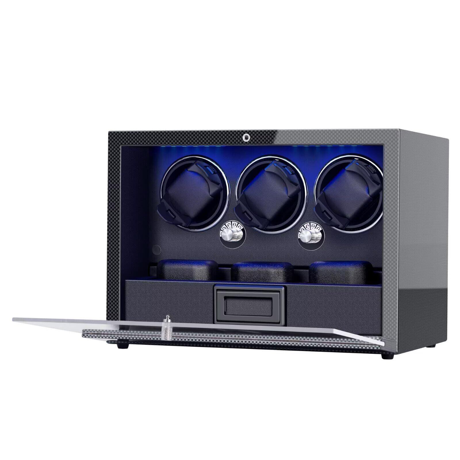 ワインディングマシーン 腕時計自動巻き上げ機 3本巻き 3本収納 ウォッチワインダー (カーボンファイバーカバー/LED照明/静音設計) 高耐久 日本製マブチモーター