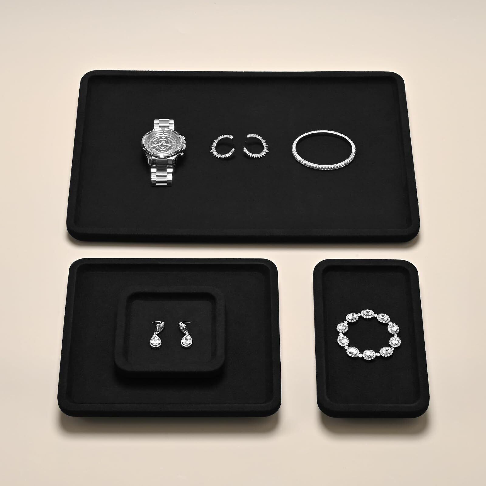 【パッケージ内容】ジュエリートレイ:1点。Sサイズ:(10*10*1.5cm/0.06kg)、Mサイズ:(18*10*1.5cm/0.1kg)、Lサイズ:(20*18*1.5cm/0.22kg)、LLサイズ:(35*24*1.5cm/0.51kg)。カラー:ベージュ、ブラックとブルーの3色展開です。️お届けした商品にはジュエリーは付いていません。