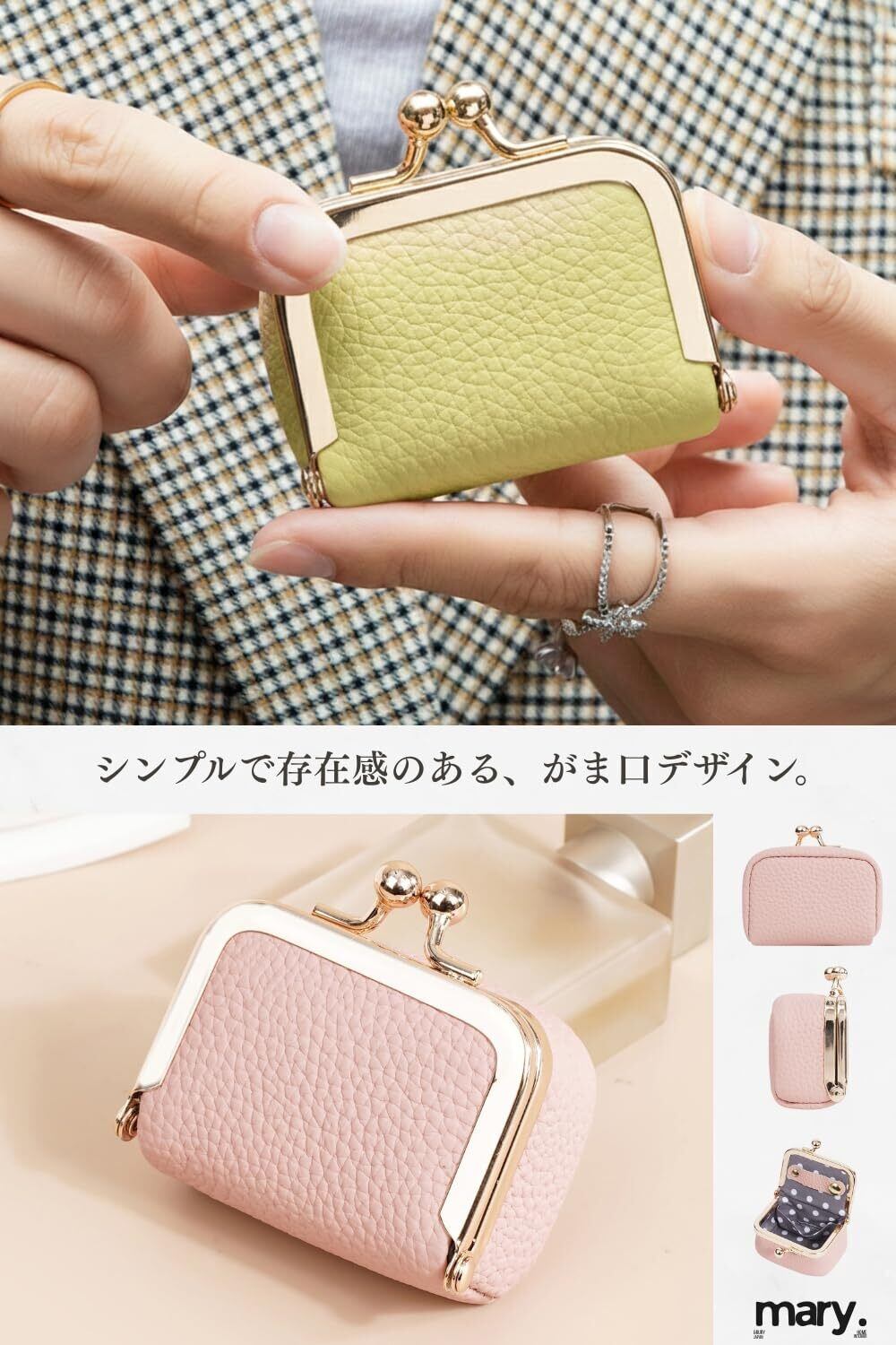 【コロンと可愛いがま口フォルム】 マカロンのように丸みのある、愛らしい「コロン」とした形状が特徴。パチンと開くがま口は見た目が可愛いだけでなく、中身がよく見えて取り出しやすい実用性も兼ね備えています。