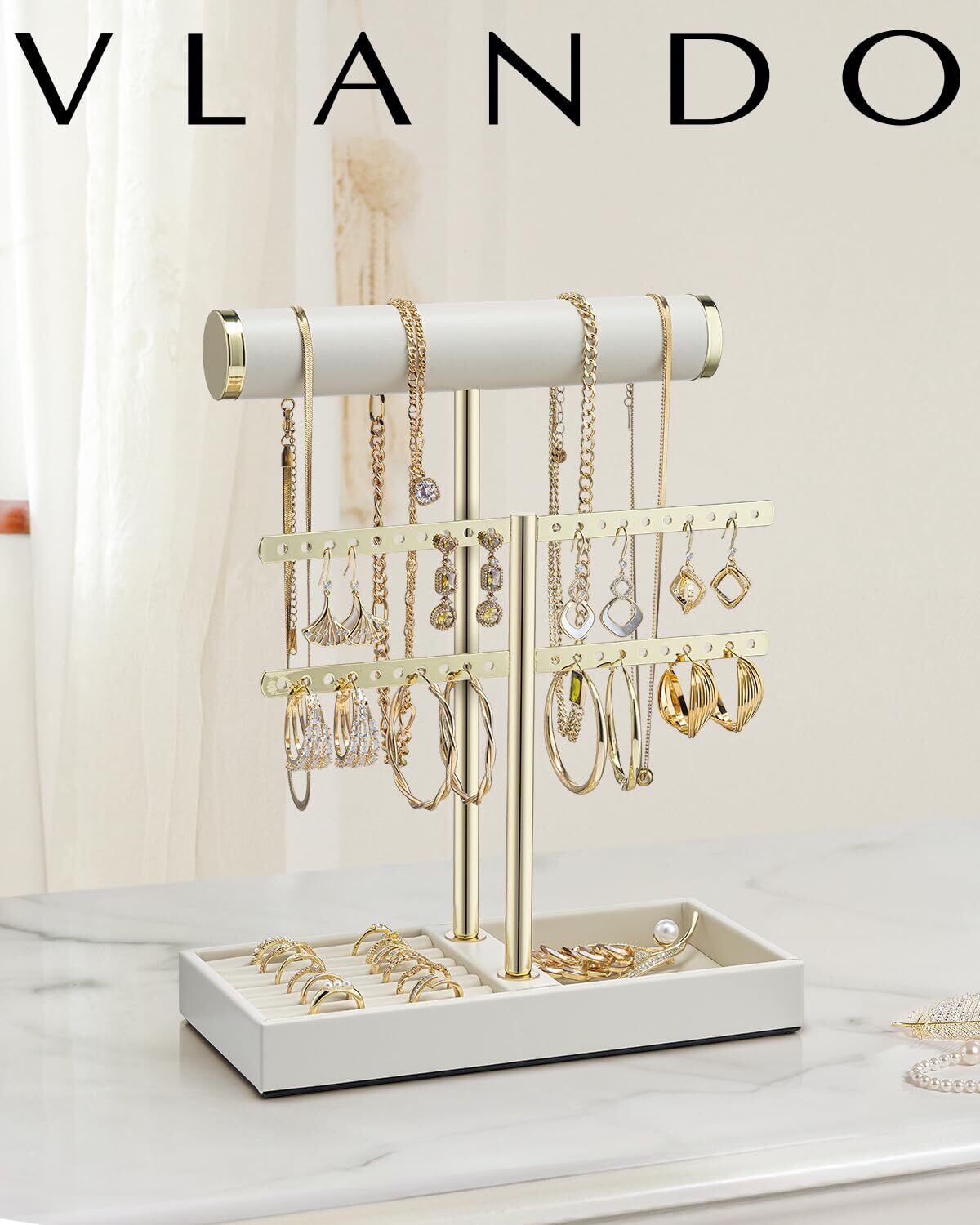 Vlando アクセサリースタンド 2段 ネックレススタンド PUレザー トレー アクセサリー収納 ジュエリーケース ネックレス ピアス リング ブレスレット フック 誕生日プレゼント クリスマス 女性用(アイボリー)