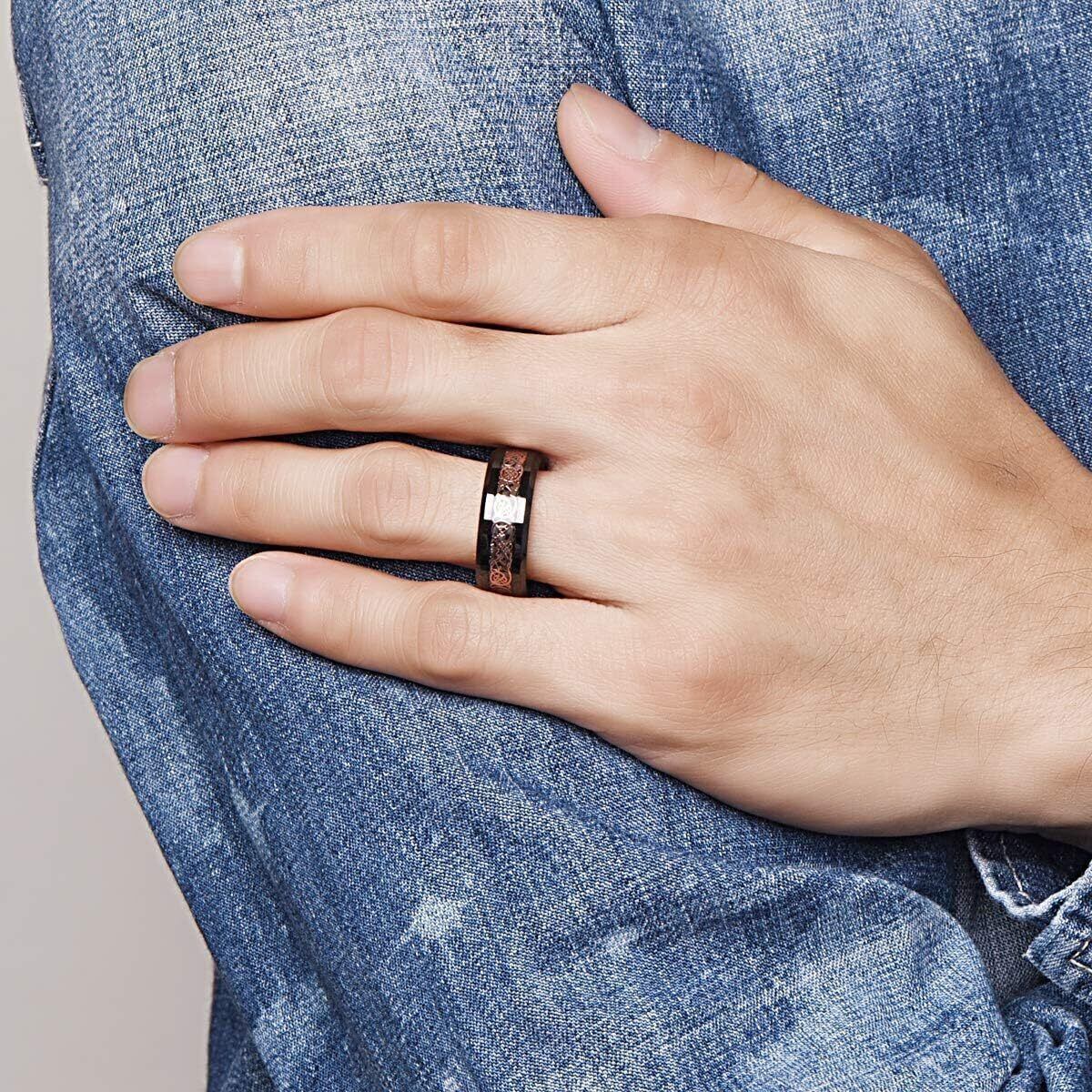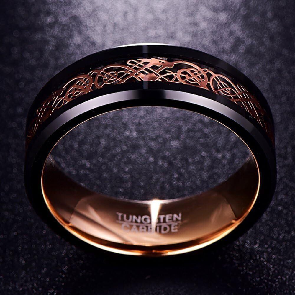 【人気商品】083基地 メンズ 指輪 リング タングステン ドラゴン 竜紋 カーボン 炭素繊維 横幅8mm 平打ち ピンクゴールド 真空メッキ 20号