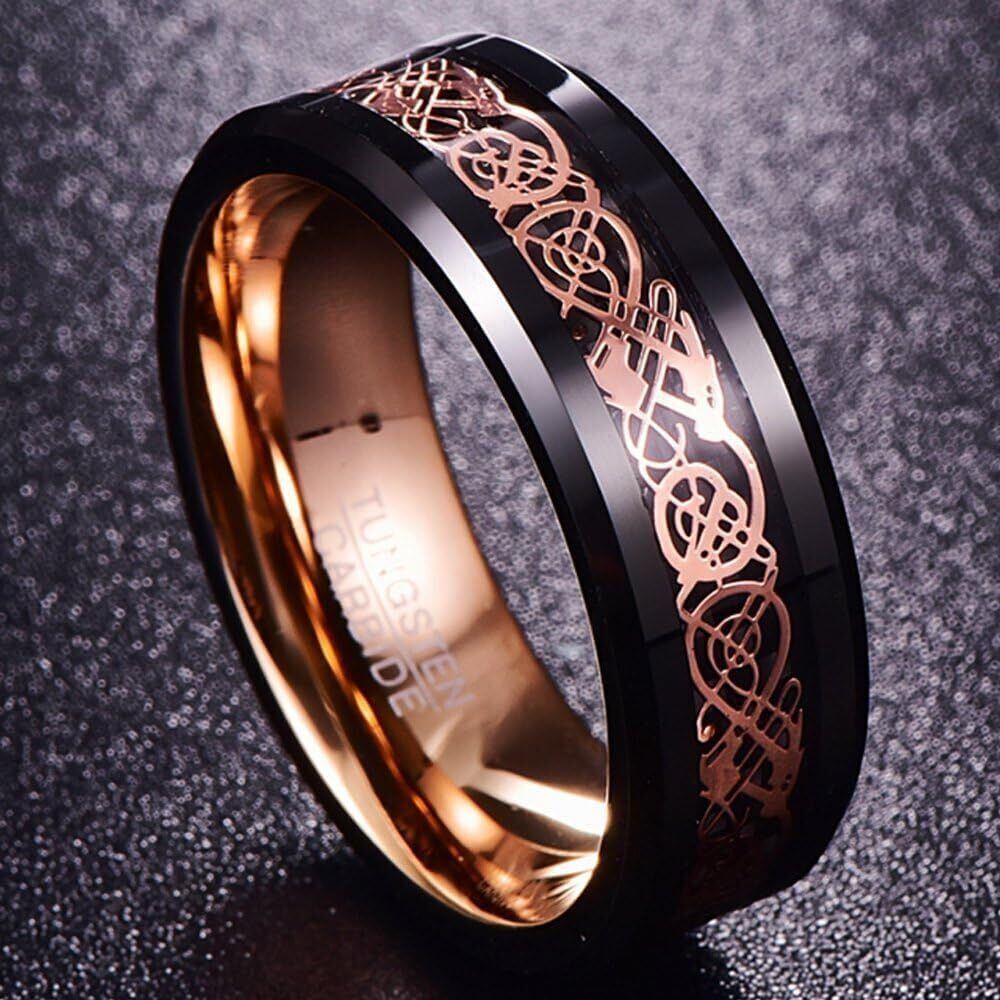 083基地 メンズ 指輪 リング タングステン ドラゴン 竜紋 カーボン 炭素繊維 横幅8mm 平打ち ピンクゴールド 真空メッキ 20号