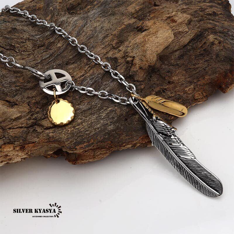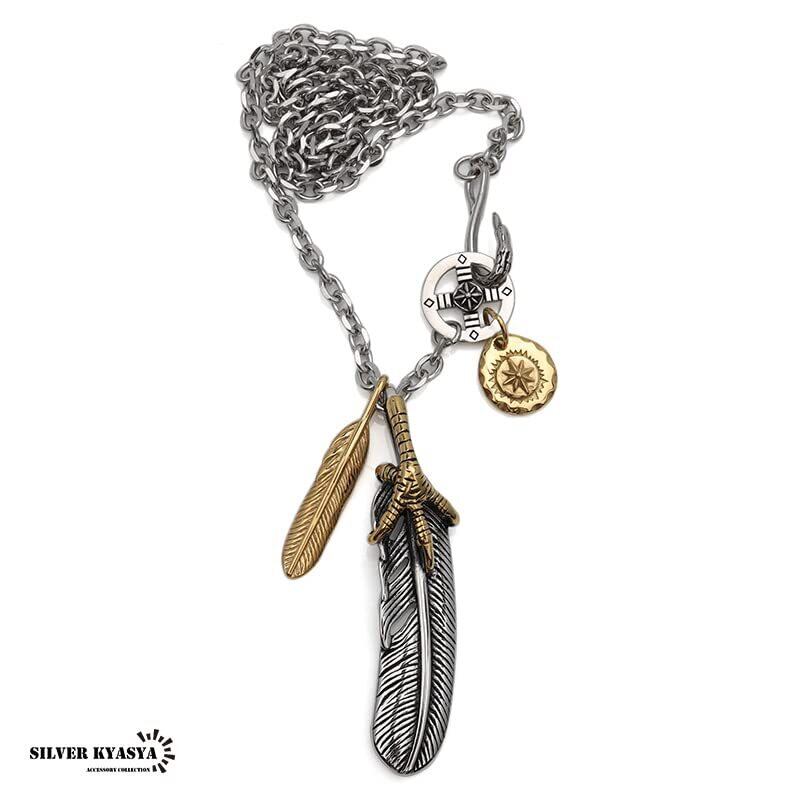 [silver KYASYA]316L ステンレス 特大フェザーネックレス 金爪フェザー ネックレス ペンダント 太陽メタル 人気