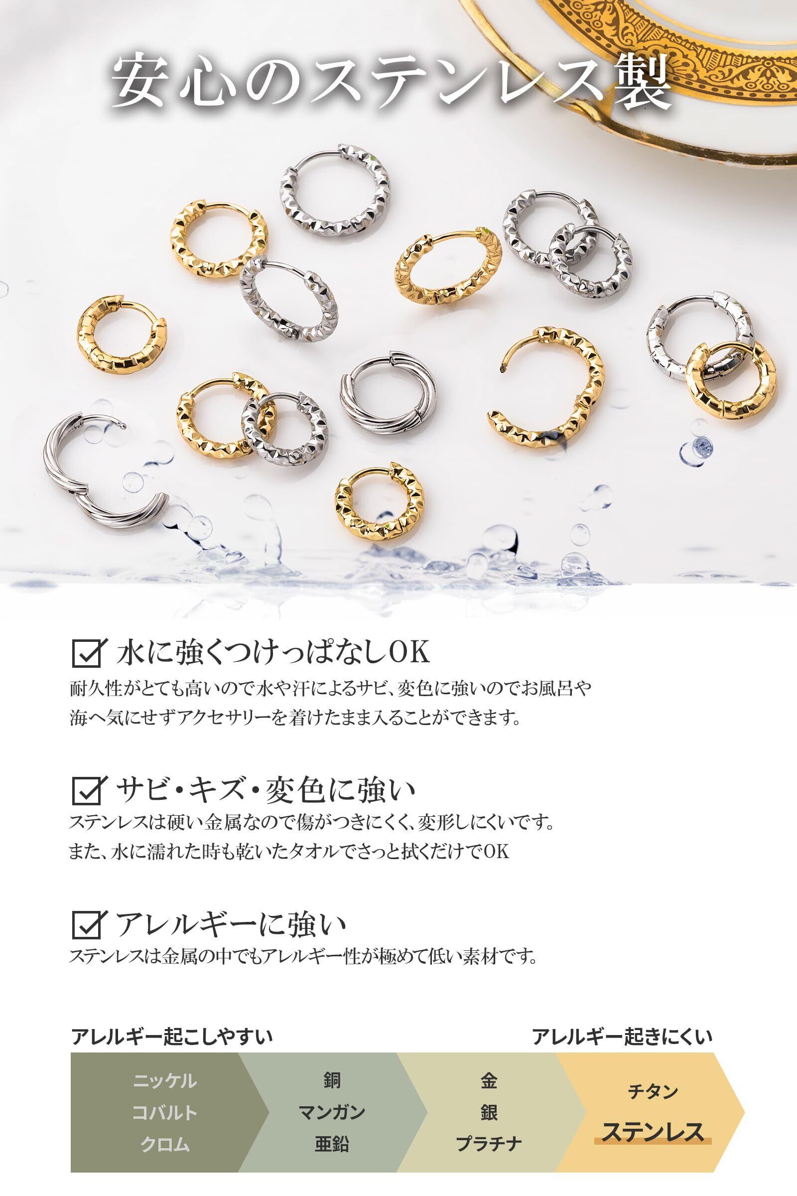 【金属アレルギー対応】 ステンレスは金属の中でもアレルギー性が極めて低くアクセサリーとして多く使用される人気の素材です。 【お風呂、海OK】 耐食性がとても高いので水や汗によるサビ、変色に強いのでお風呂や海へ気にせずアクセサリーを着けたまま入ることができます。 【お手入れ簡単】 ステンレスは硬い金属なので傷がつきにくく、変形しにくです。また水にぬれた時も乾いたタオルでさっと拭くだけでOK