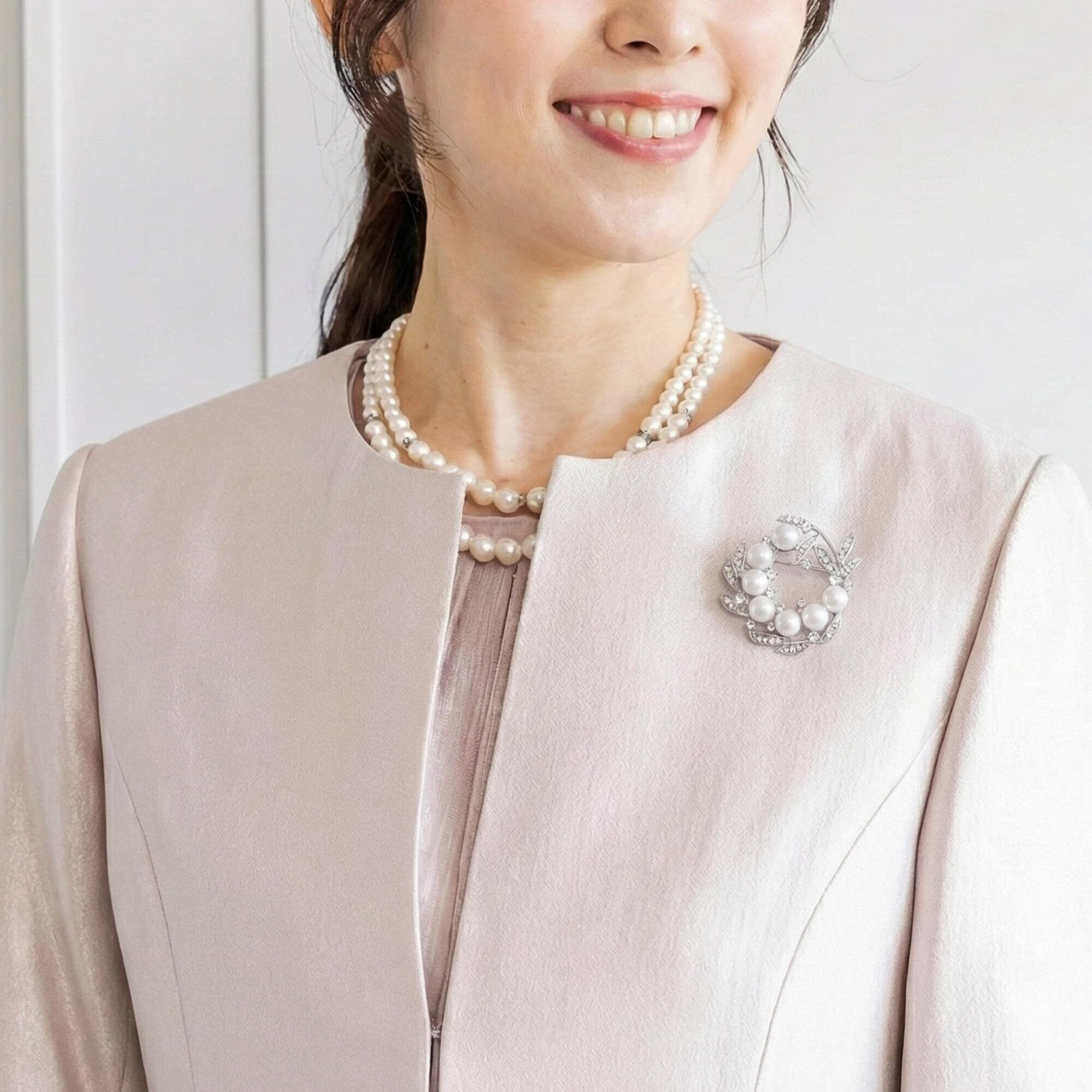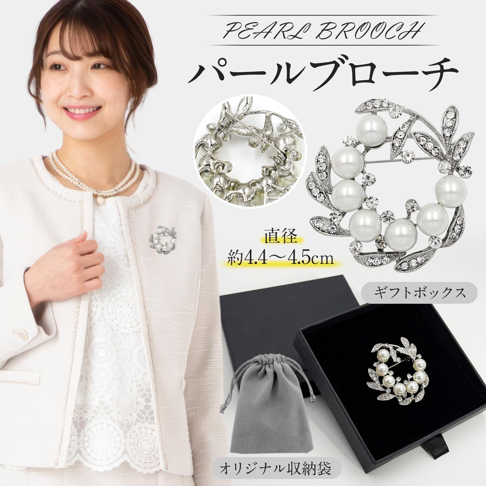 【Aタイプ:パール シルバー リーフ】 サークル状の葉型デザインにパールをあしらったブローチ。白く上品なパールとシルバーのラインストーンの組み合わせが、清楚でありながら華やかさを感じさせます。リースのようなボタニカルなデザインが、どんなコーディネートにも自然になじむワンポイントアクセントに。・材質:ニッケルフリー合金(金属アレルギー対応)、フェイクパール、キュービックジルコニア(人工石)。・ギフトボックス+オリジナル収納袋付き!直径約4.4~4.5cmの円形サイズ