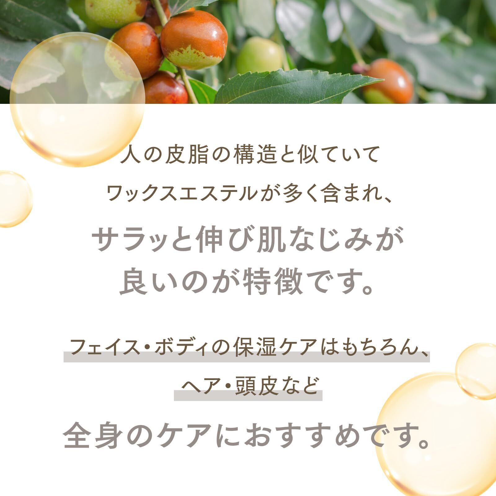 【全身使えるオイル】ホホバオイルの主成分である“ワックスエステル”は、肌にも存在する成分のため、肌なじみが良いのが特徴です。肌に塗布することで皮膚のバリア機能である皮脂膜を形成し、肌の水分保持機能をサポートして皮脂バランスを調整してくれます。肌を保護することが期待されるため、敏感肌の方でもお使いいただけます。 また、ホホバオイルはクリームやシャンプーの原料としても使用されているため、ボディケアはもちろん、フェイシャルケアやヘッドマッサージに使用することもおすすめです。