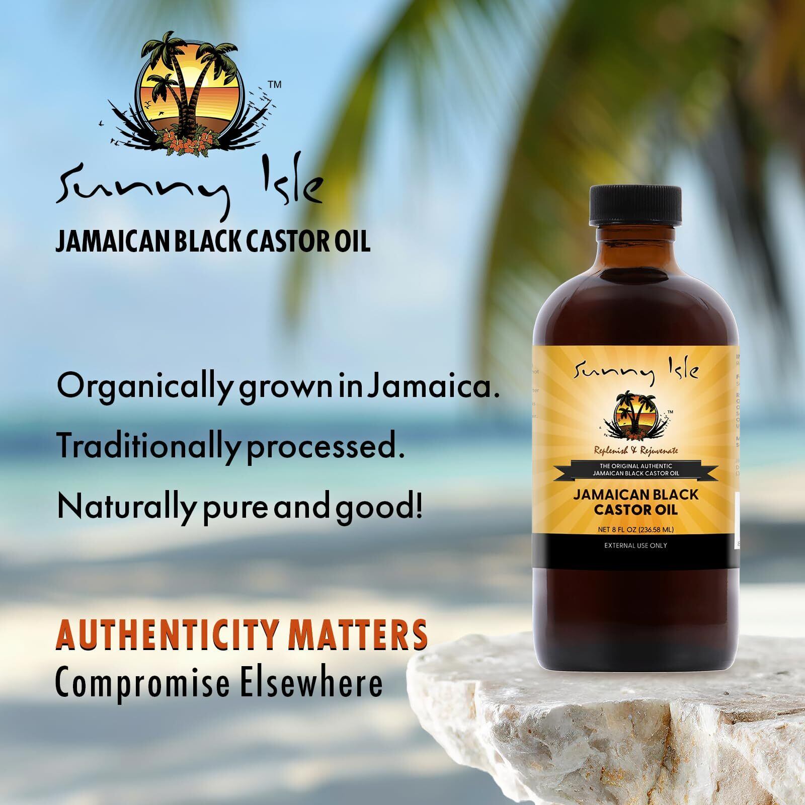 Sunny Isle Jamaican Black Castor Oil is processed the traditional way., ur Organic seeds are roasted and ground by a manual Grinder and then the crushed beans are boiled to extract the 100% pure, dark brown, organic oil., It's the best quality oil on the market. Why you may ask? Compared to other brands it is the darkest Jamaican Black Castor Oil because we roast our beans longer which produces more Ash Content in our oil than any other oil on the market., ans longer which produces more Ash Content in our oil than any other oil on the market. More ash content increases the effectiveness of the oil. Therefore the Sunny Isle brand will strengthen and increase the length of your hair faster than any other brands on the market today., Sunny Isle Jamaican Black Castor is the ONLY Jamaican Black Castor Oil that comes in a safety sealed bottle for your protection.