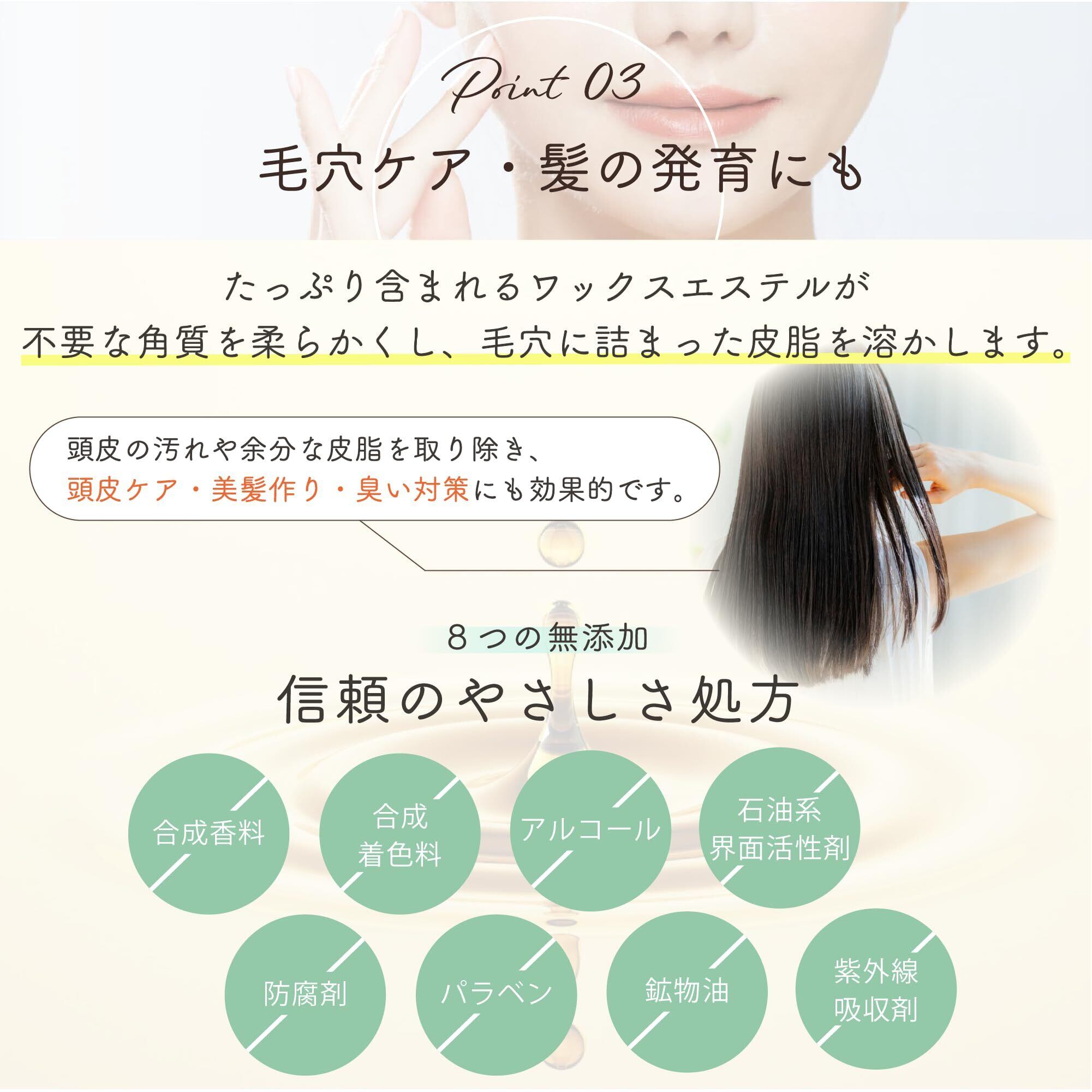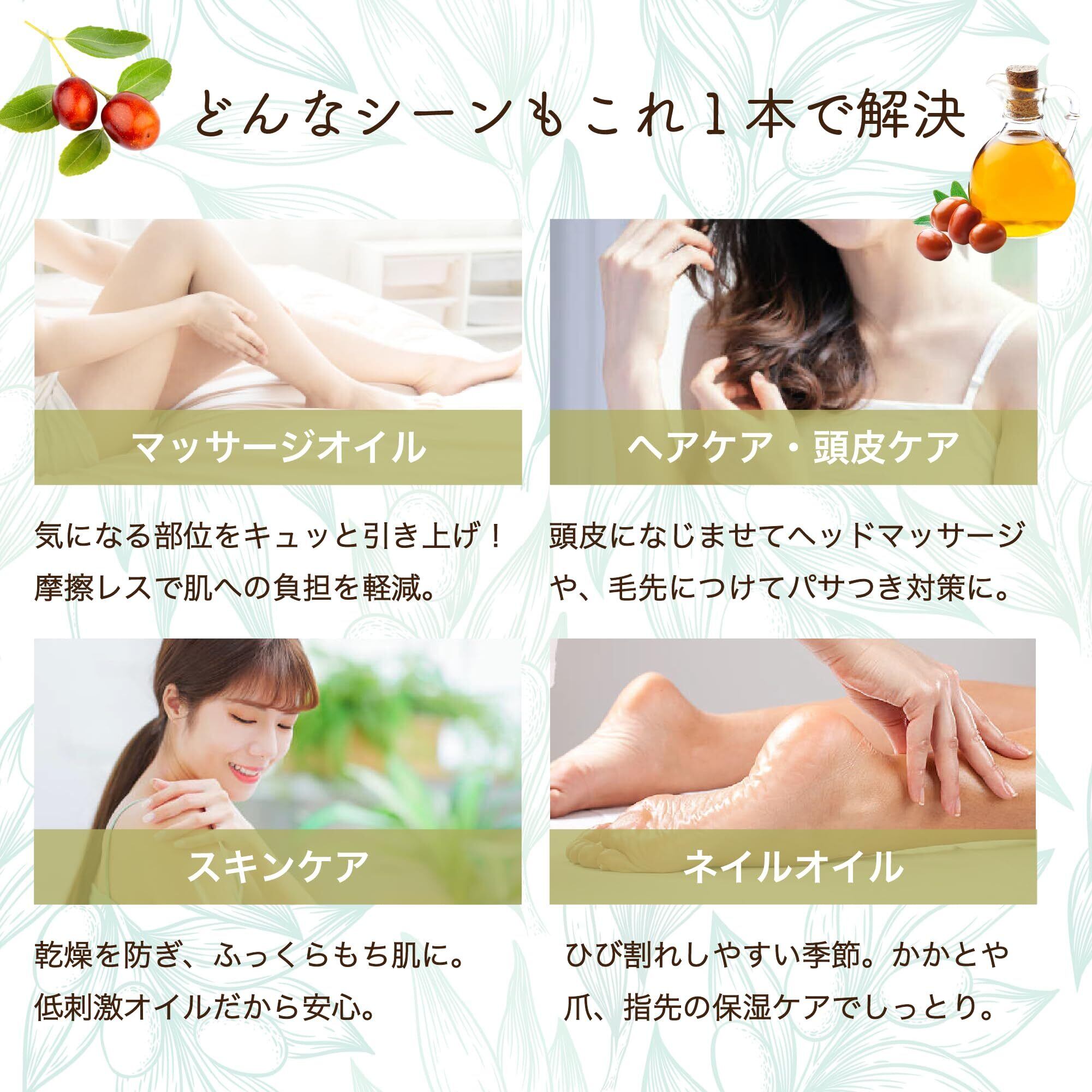 【多用途で大活躍!】①スキンケア:体を清潔にした後の保湿ケアにぴったり。乾燥した肌にしっかり潤いを与え、しっとり柔らかな肌に。②マッサージオイル: ゆっくりとマッサージしながら全身に浸透させ、リラックス効果も期待できます。③ヘアケア: 髪に艶と潤いを与え、ダメージをケアします。④ネイルケア: 爪の周りの乾燥を防ぎ、しっとりとした健康的な爪に導きます。