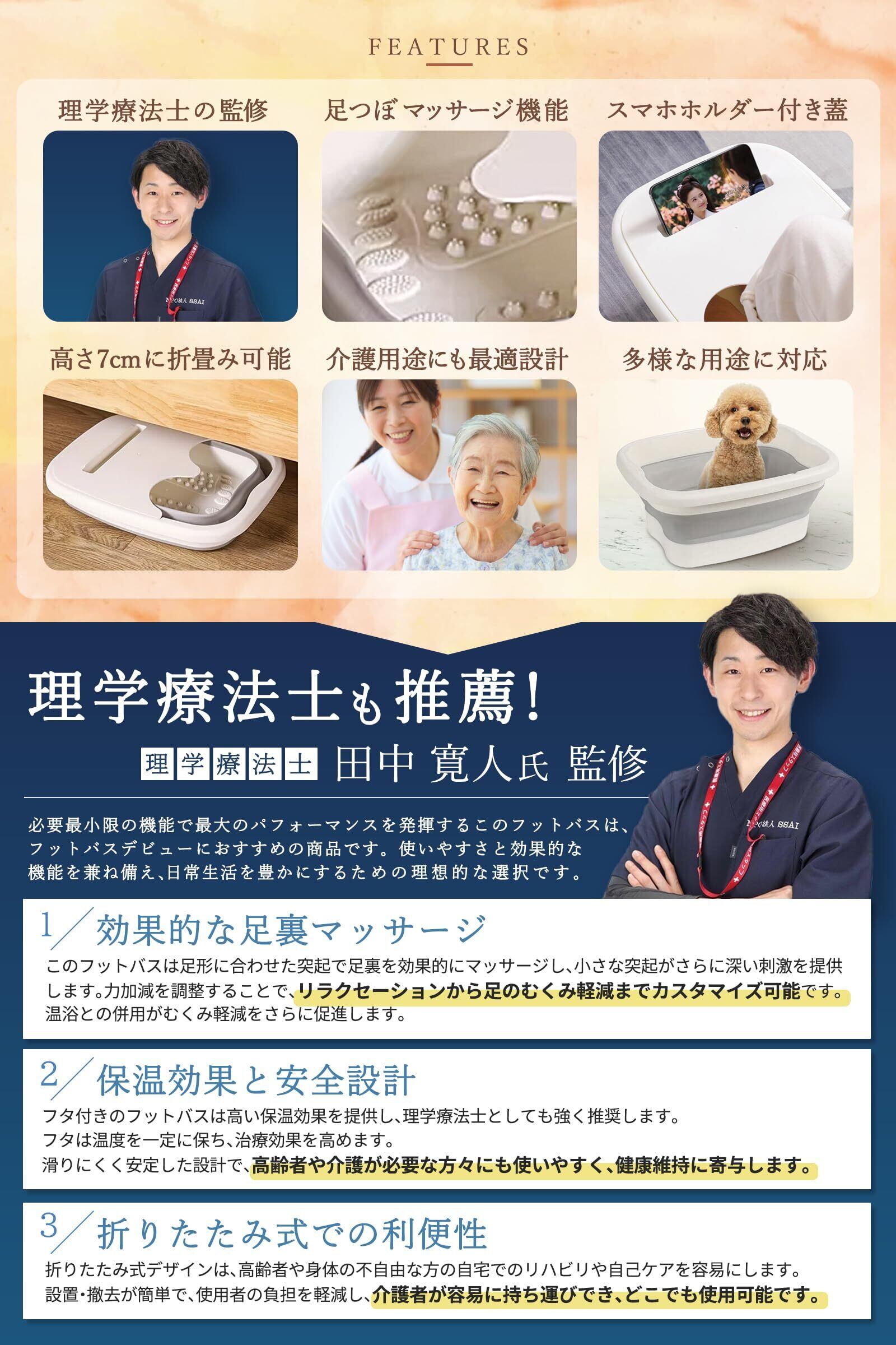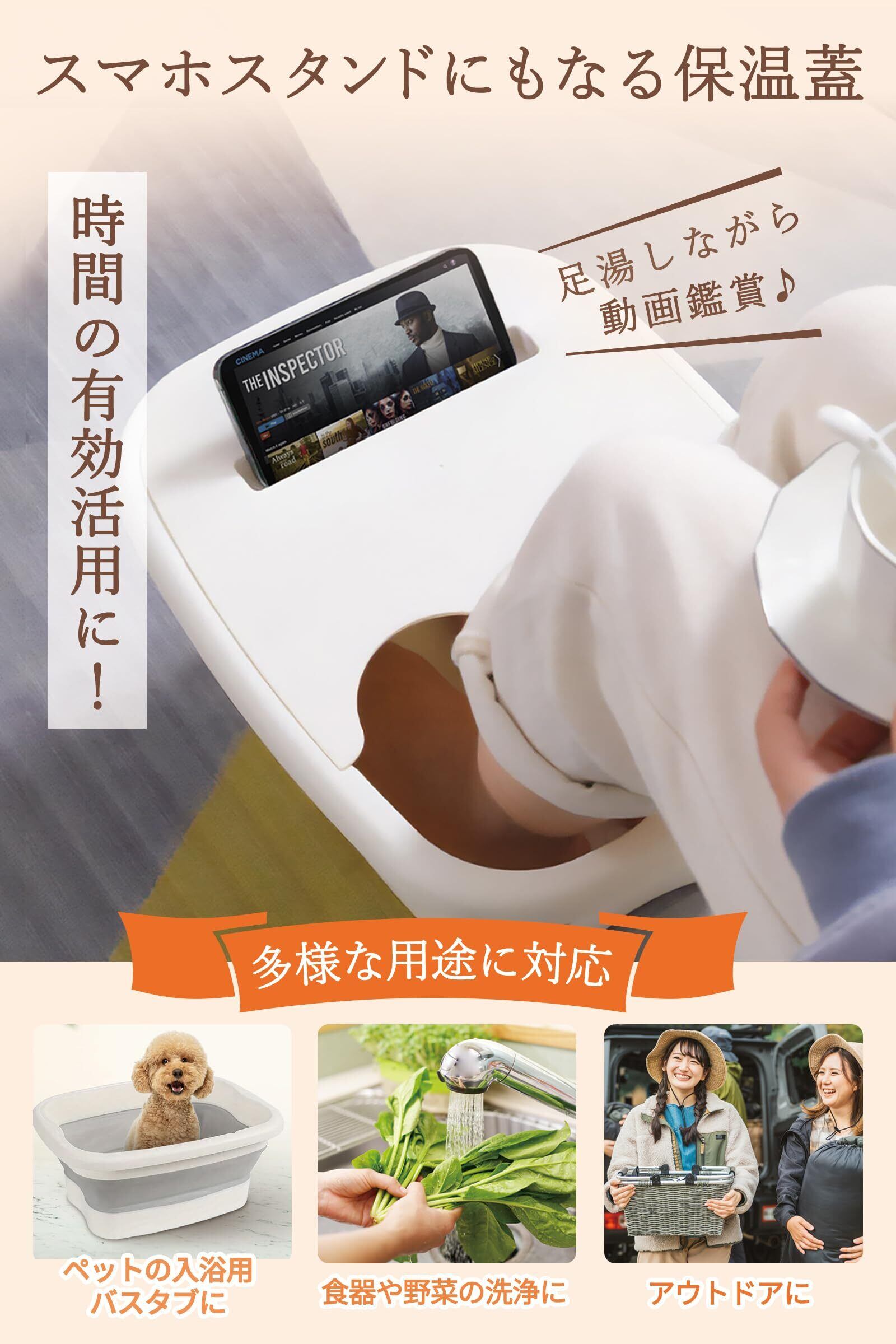 足の疲れやむくみをやさしくケアする、折りたたみ式の本格フットバス。足裏に心地よい刺激を与える突起構造と、高い保温効果で、リラックスタイムをより快適に。使用後はコンパクトに折りたためて収納も簡単。スマホを置けるフタ付きで、動画を見ながらくつろげるのも魅力です。理学療法士も推奨する安心設計で、初めてのフットバスにもおすすめです。