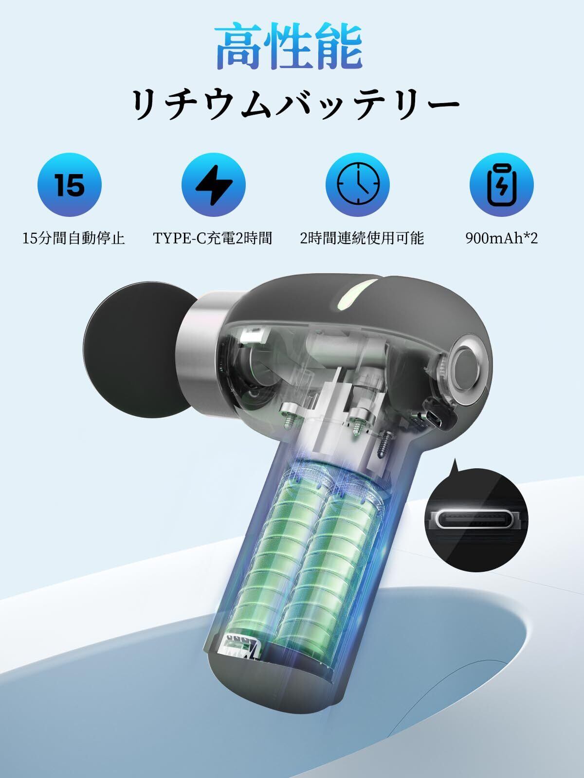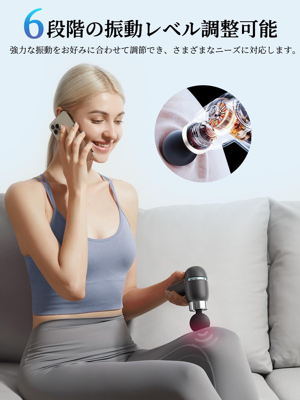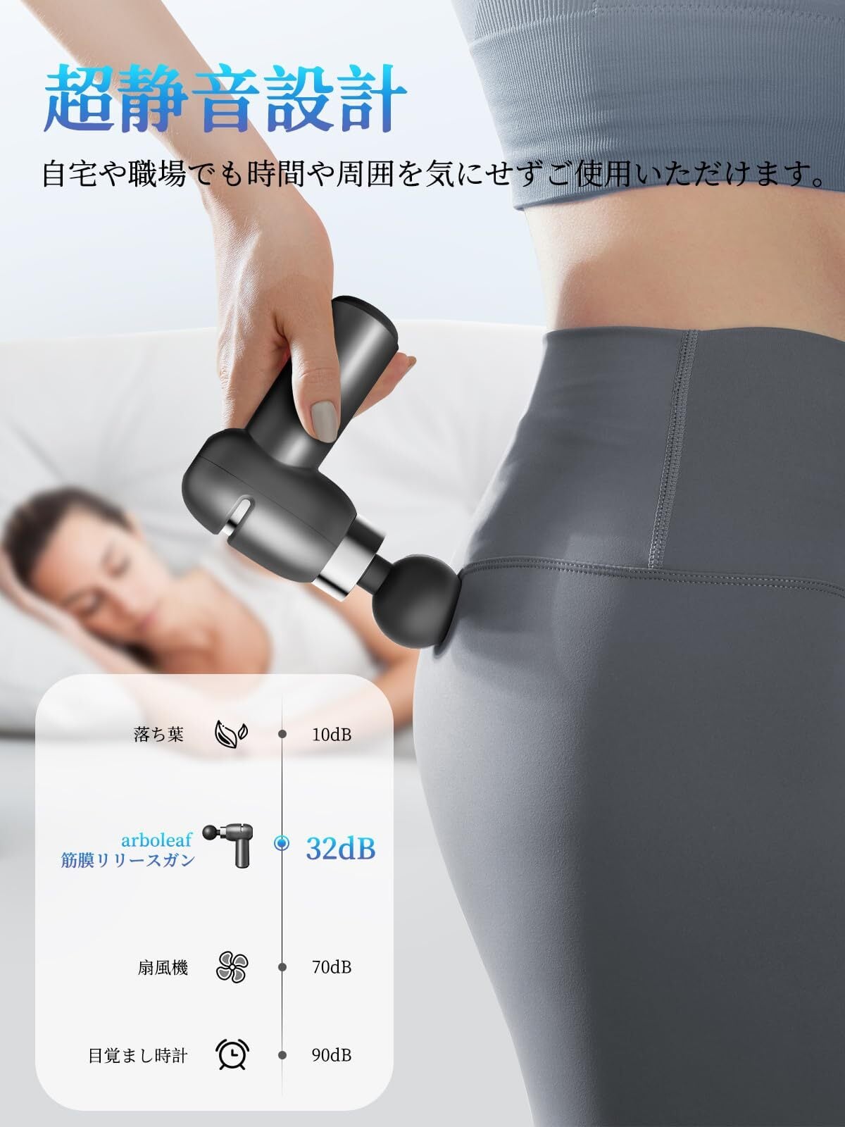 【4種類のヘッド付属・超静音設計】筋膜リリースガンは球形、U字形、平形、円錐形の4種類のアタッチメントが付属しており、足から首まで様々な部位に使用できます。 ミュートチップを搭載しており、動作音は32dB未満です。お出かけ先や夜間でも、時間や場所を気にせず使用できます。