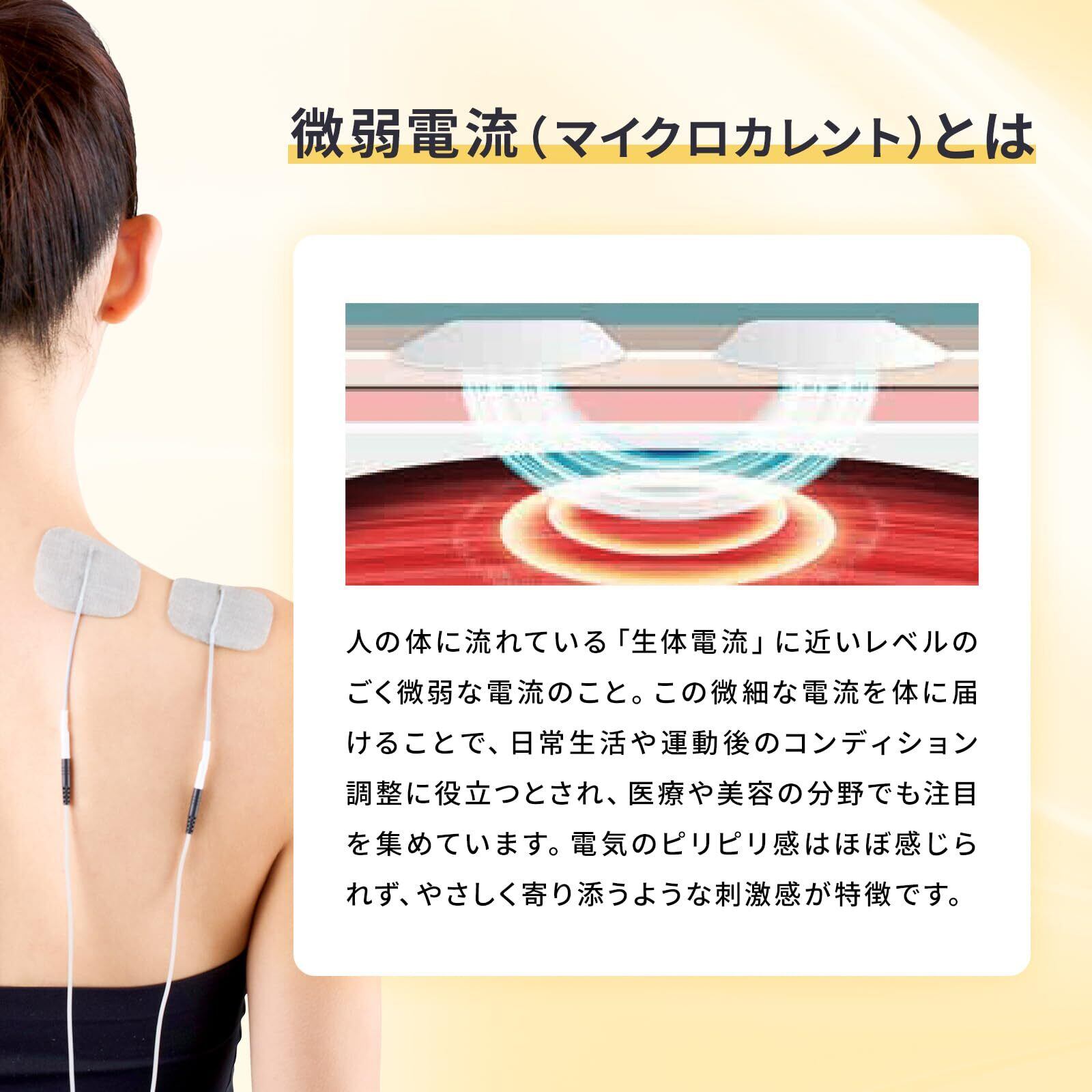 ■日々のコンディショニングケアに最適なマイクロカレントを搭載 人体にもともと存在している生体電流に似た極めて弱い電流を流すことで、日々のコンディショニングケアや運動後のトリートメントに効果的。
