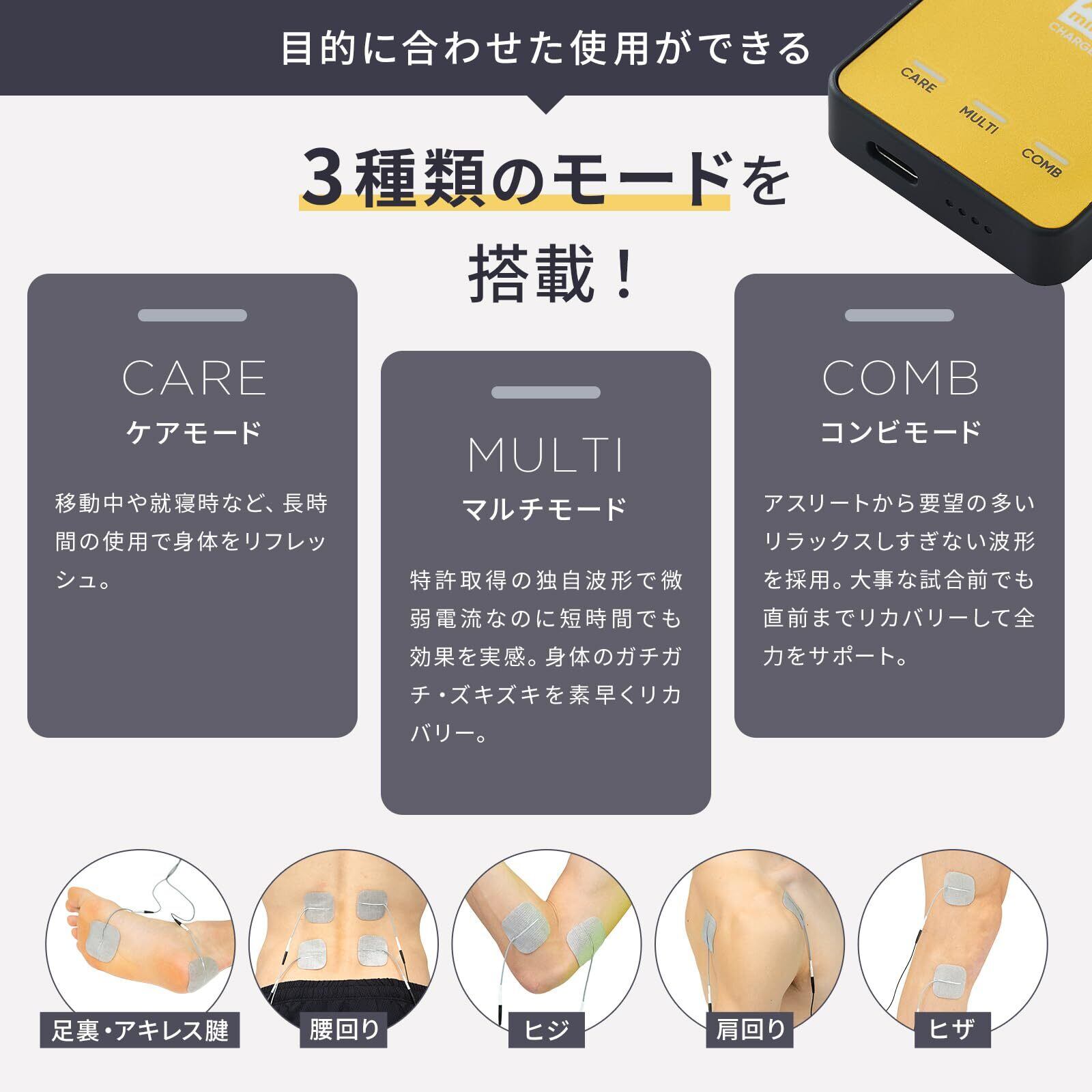 ■目的にあわせて使用できる3種類のモードを搭載 CARE[ケアモード]:12時間タイマー お休みの時や移動中など日々のコンディショニング・ケアにおすすめのモードです。 MULTI[マルチモード]:3時間タイマー 短時間でのリフレッシュに最適なモード。 アクティブだった身体をリセットでき、ストレッチや別売りのヒーリングカレント導子との併用もおすすめです。 COMB[コンビモード]:12時間モード 短時間でのリフレッシュとケアのどちらにも適したモードです。パフォーマンスを発揮したい日の前日にもおすすめです。