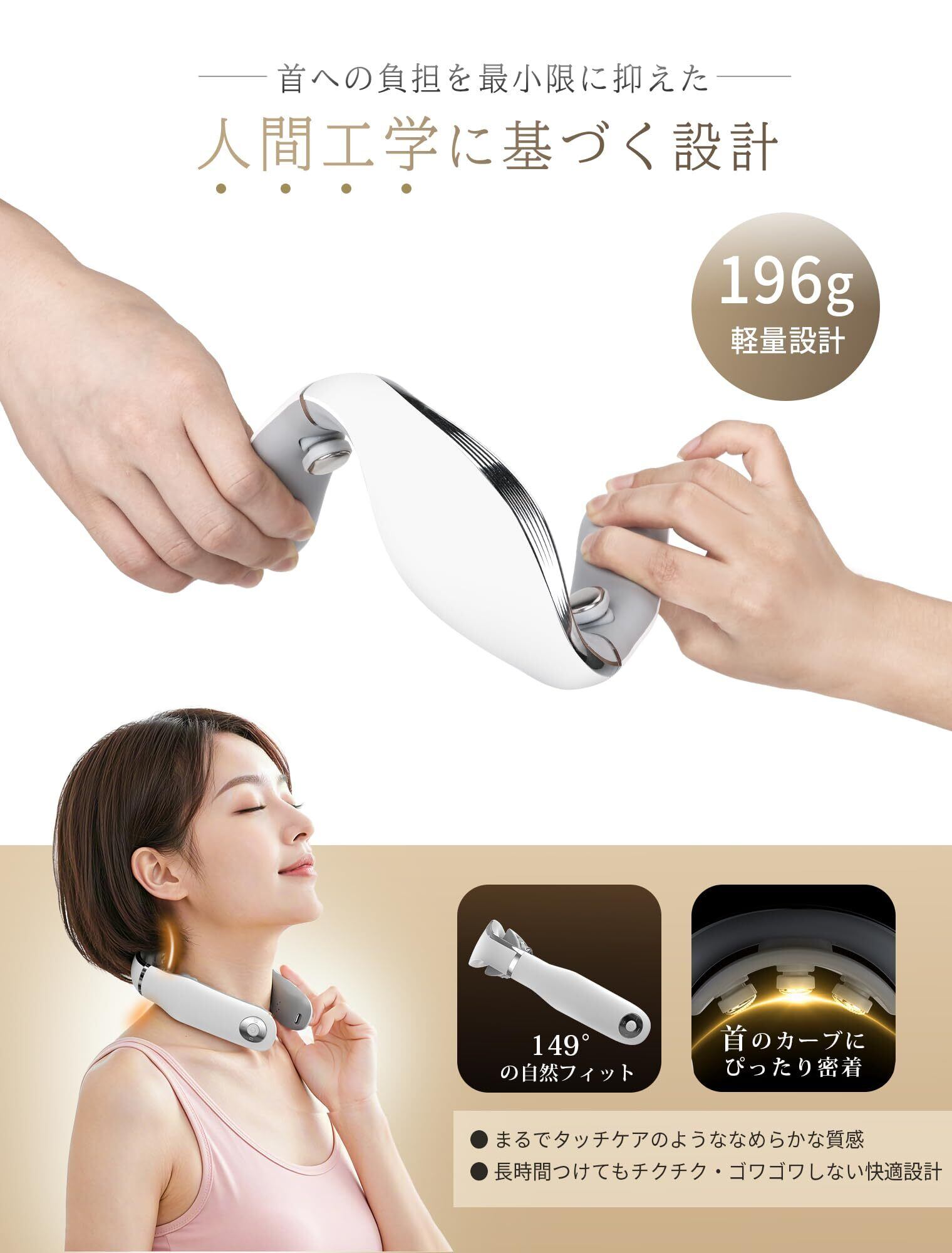 【業界初!次世代首リラクゼーション器 より深く より広く】深層ほぐすピンポイントケアと首・肩へのフールケアを両立!プロが手もみで行うような本格的な10種のネックケアを再現。独自のトリプル機能を搭載して、EMS+TENS+振動の相乗効果により、本格的な首・肩ケアを実現。やわらかタッチからしっかりケアまで、19段階で微調整可能。本格的な温熱機能を搭載し、首まわりの冷え対策にもピッタリ。温めるだけで、ずいぶん楽になる快適サポートされます。※温熱のみ単体使用もOK!