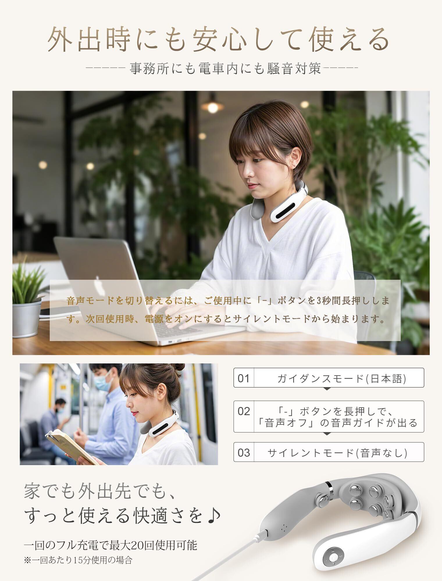 【さらに進化ポイント!外出時騒音対策&シンプルな操作性】コンパクトなサイズ感、片手で使えるシンプルな操作性で仕事や家事をしながら、など"ながら"使いが可能に。ディスプレイ:各種モードの選択がはっきりと表示されており、ボタンで操作できます。1200mAhバッテリー:Type-C充電式で、1回の充電で約2時間使用可能(※ご利用環境と充電ヘッドにより異なります)、外出先でも便利。※最大DC5V2A|スマホ急速充電器は故障の原因になります。音声モード&静音モード:ケアモードと強さを音声ガイダンスでお知らせします。「‐」を長押しで音声はON/OFFの切替られます。前回選択された静音モードは次回使用時、そのままで静音モードを維持します。メモリー機能搭載:ワンタッチで理想のネックケアモードと強度が再現できます。多機能性と便利さを両立ます。