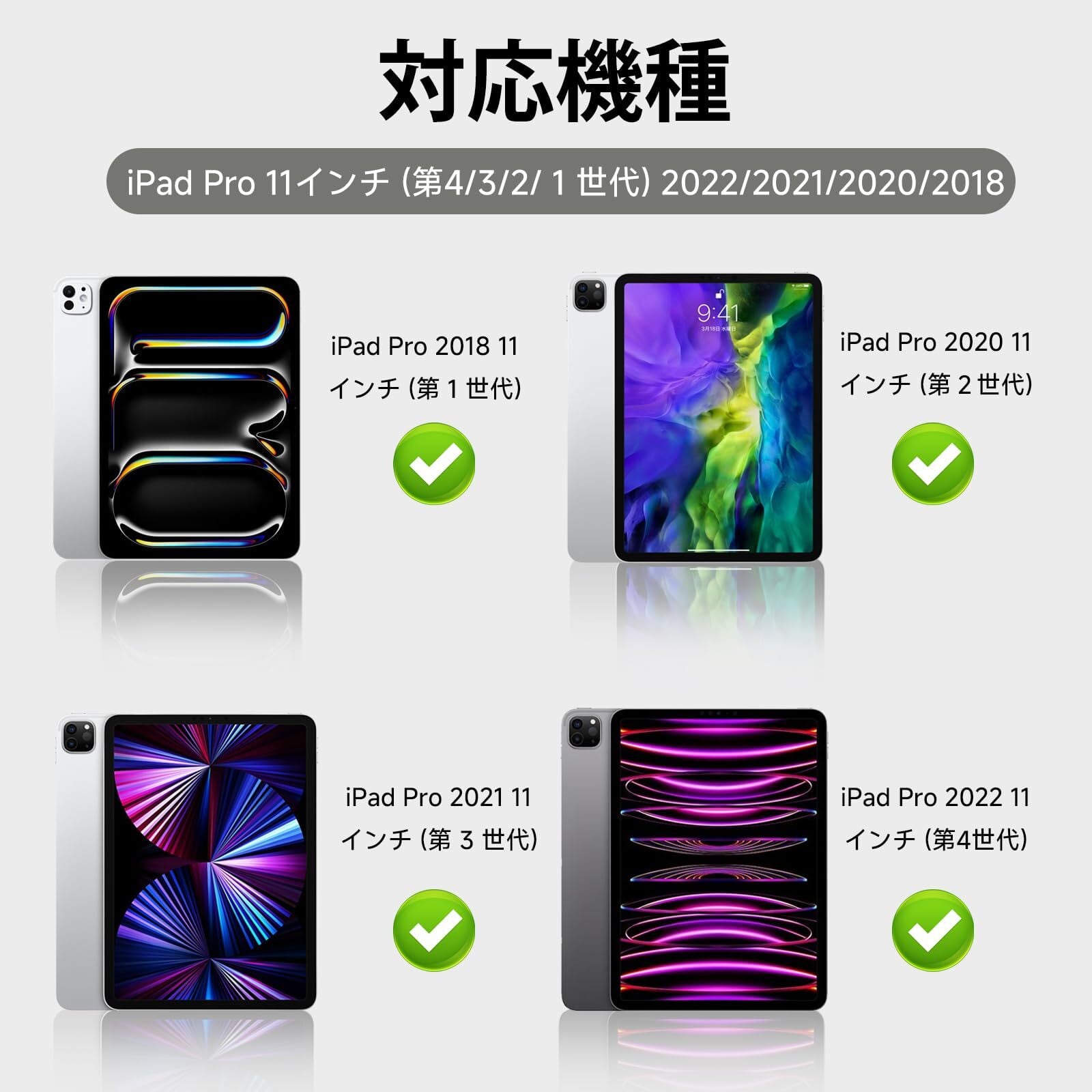 1.【対応機種】iPad Pro 11インチ 第4世代(2022年モデル、モデル番号:A2759 A2761 A2435)/ iPad Pro 11インチ 第3世代(2021年モデル、モデル番号:A2459 A2301)/ iPad Pro 11インチ 第2世代(2020年モデル、モデル番号:A2228 A2068 A2230)/ iPad Pro 11インチ 第1世代(2018年モデル、モデル番号:A1980 A2013 A1934)の専門設計です。※ご注意:iPad本体の裏面に記載されているモデル番号をご確認の上、正しい型番をお選びください。