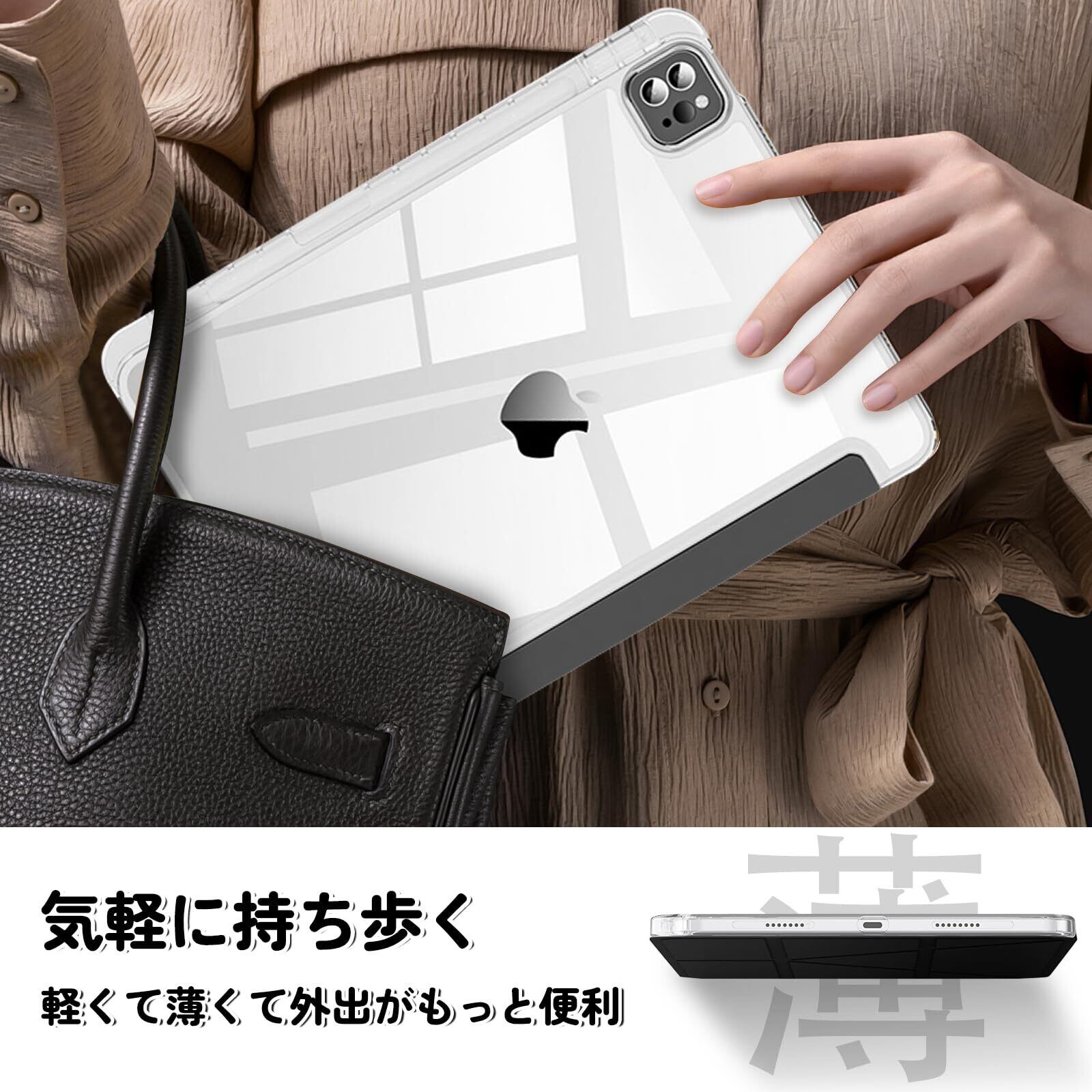 3.【透明バックカバー】このタブレットケースは薄型・軽量のPUレザー製ケースを採用し、フロントカバー内部に均等に配置された複数の磁石を内蔵しています。フロントカバー内側は極細繊維素材を使用しており、摩擦によるスクラッチを低減し、LCDスクリーンを保護しつつ清潔を保ちます。透明バックカバーは柔軟なTPUフレームを搭載し、取り付けが簡便です。また、バックカバー本体はPC素材で製造されており、タブレット端末を衝撃から効果的に守ります。(※注意:透明バックカバーには保護フィルムが貼り付けられていますので、使用前に必ず剥がしてください。)