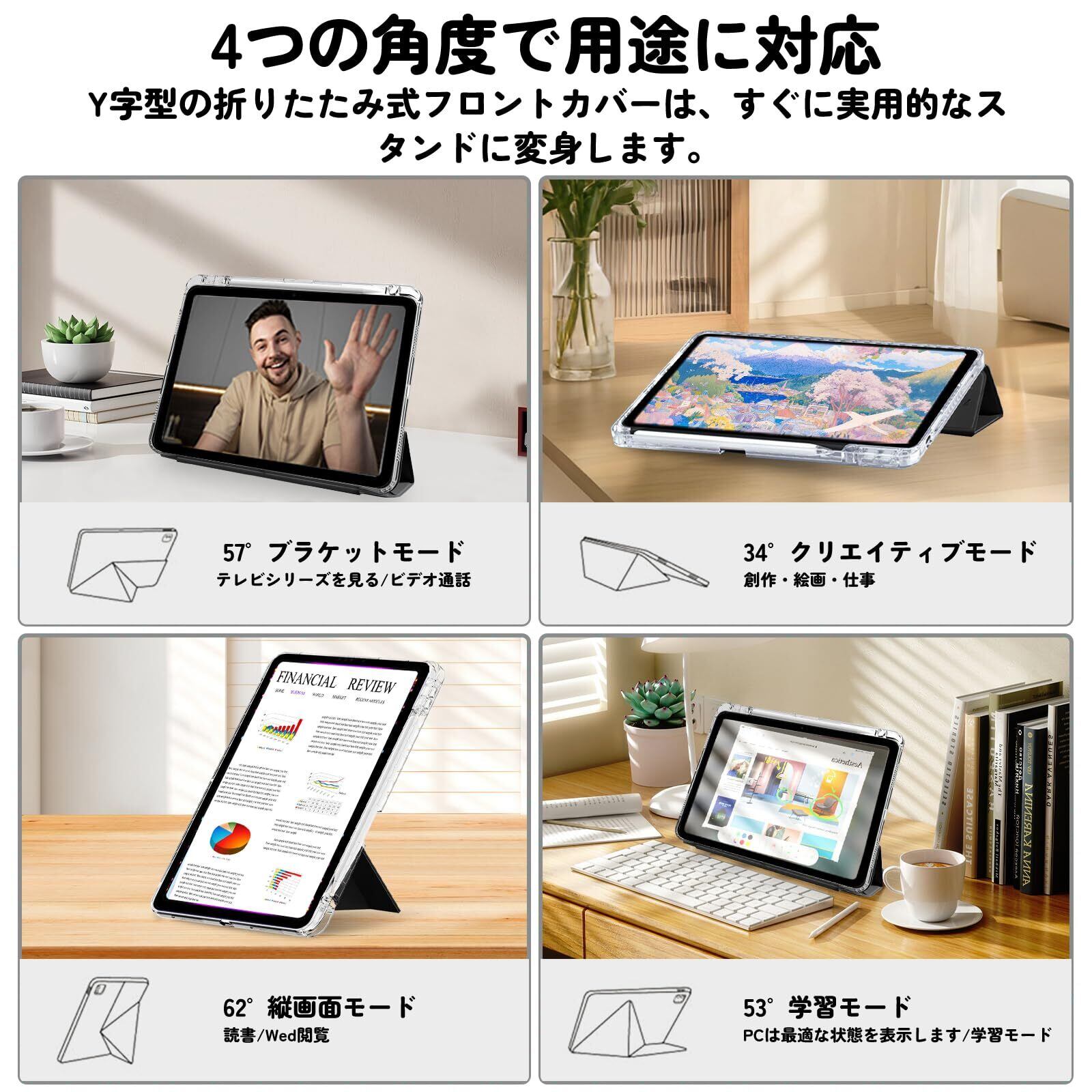 2.【横/縦置き回転、倒れない縦置き】横置きと縦置き両方を叶えるスタンド機能は使いやすくて便利です。三角形の抜群安定感により倒れなく使えます。折り紙のようにおることで角度は4つ選択でき(34°、53°、57°、62°)、ネットサーフィンに動画鑑賞、勉強等の作業向けとスムーズに素早く切り替えられる。
