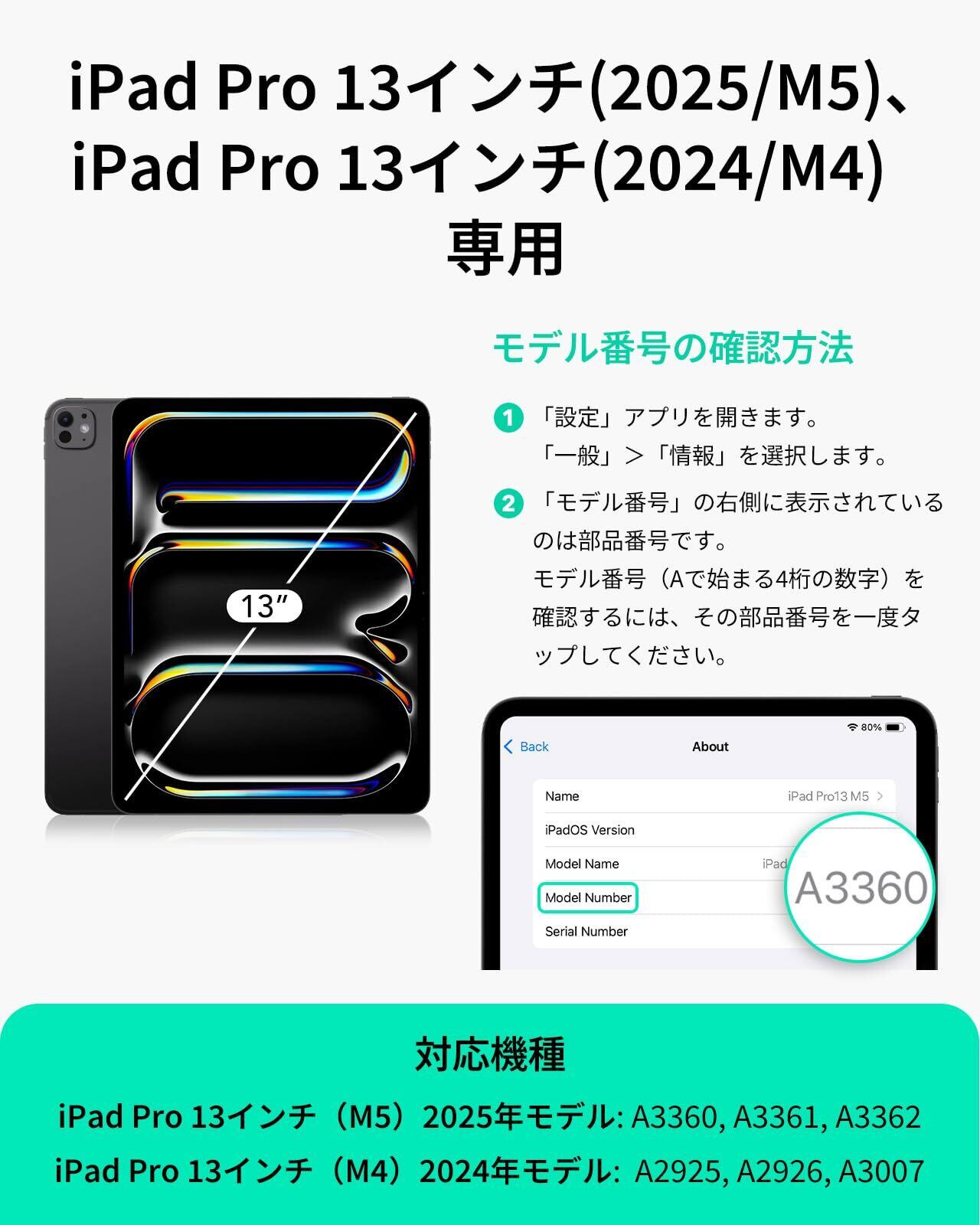 【対応機種】:iPad Pro 13インチ(M5/M4)2025/2024年モデル専用。対応モデル番号:A3360、A3361、A3362、A2925、A2926、A3007。※iPad Pro 12.9インチ(2022/2021/2020)、iPad Air 13インチ(2025/2024)およびその他のiPadモデルには対応していません