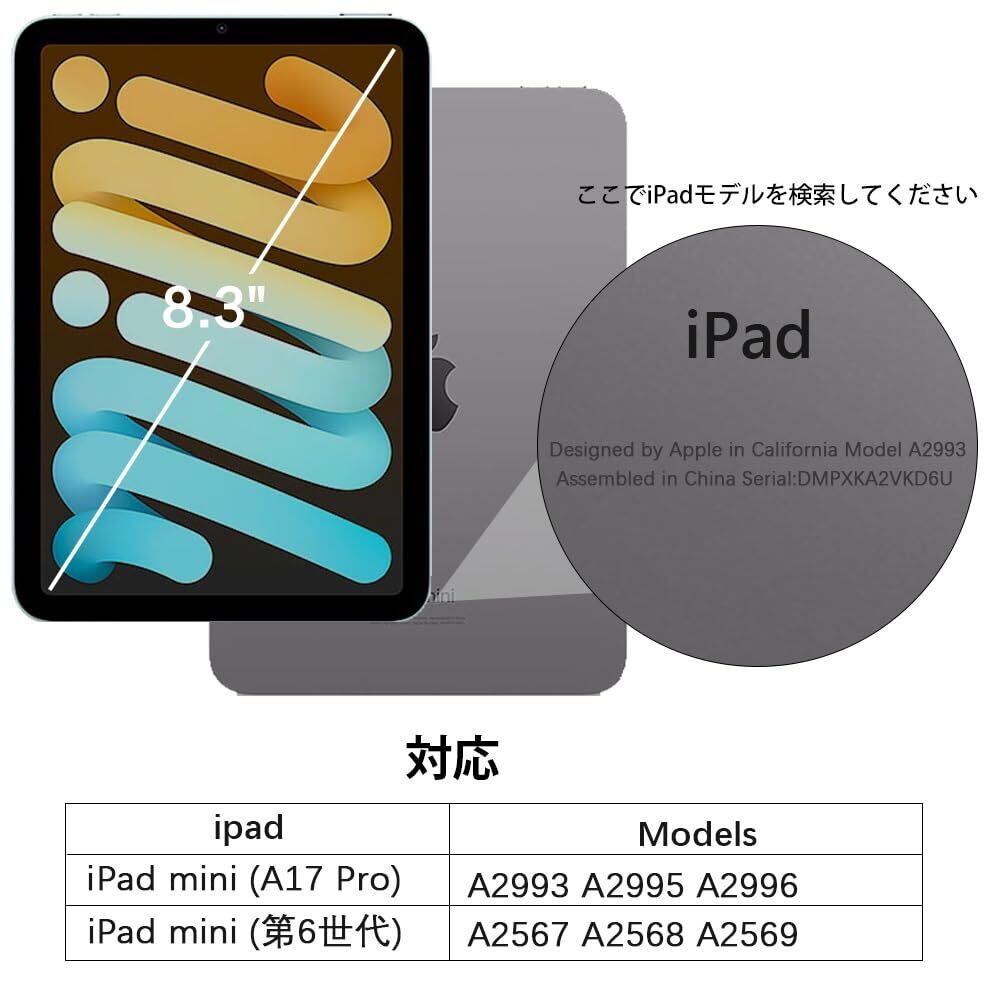 【 対応機種 】iPad mini (A17 Pro) 2024年発売モデル 8.3インチ アイパッドミニ7 / iPad mini ( 第6世代 ) 2021年発売モデル 8.3インチ アイパッドミニ6 (対応モデル番号: A2993 A2995 A2996 A2567 A2568 A2569。ご注意:ご購入前に、お使いのデバイスの型番をご確認ください。 「設定」>「一般」>「情報」の順に選択します、「モデル番号」フィールドをタップしてAモデル番号を表示します。
