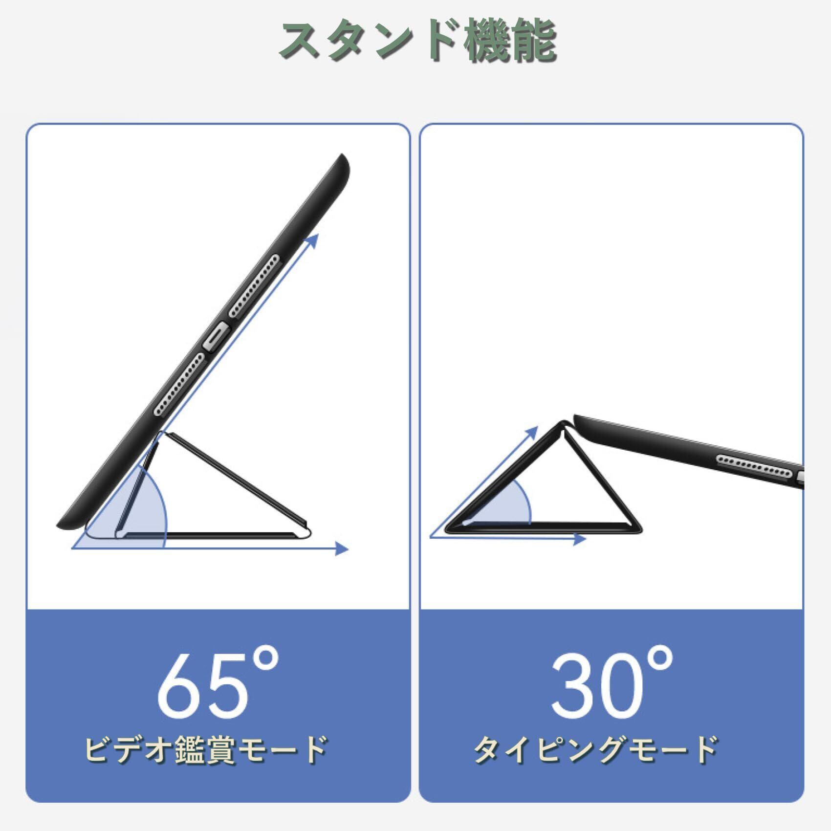 マグネット内蔵、オートスリープとオートウェイクアップ機能が付きます。三つ折りフロントカバーにより、視聴とタイピングに合わせた2通りのスタンド角度を調整できます。スタンドが正しく機能していることを確認するために、折り目の正しい向きを確認してください