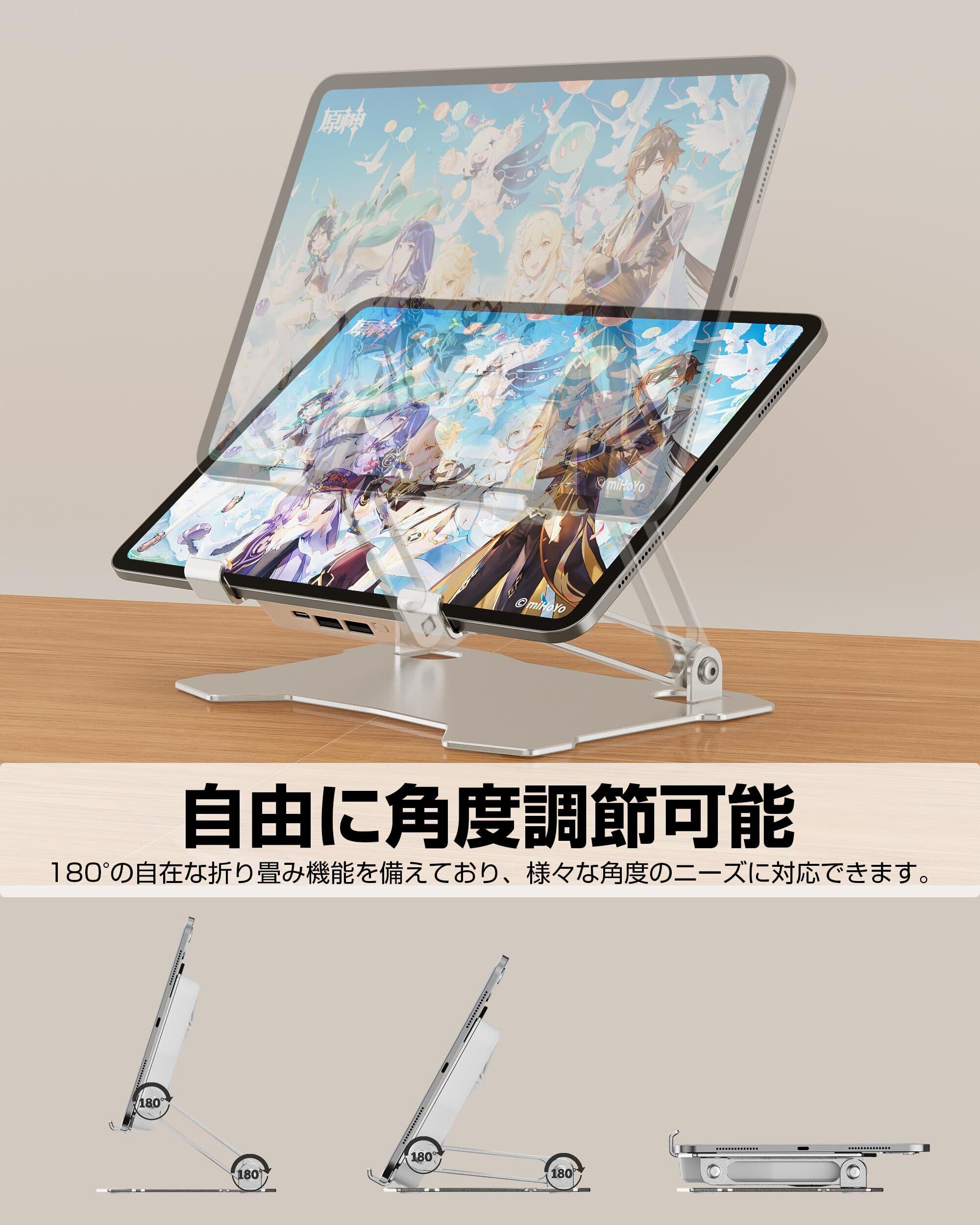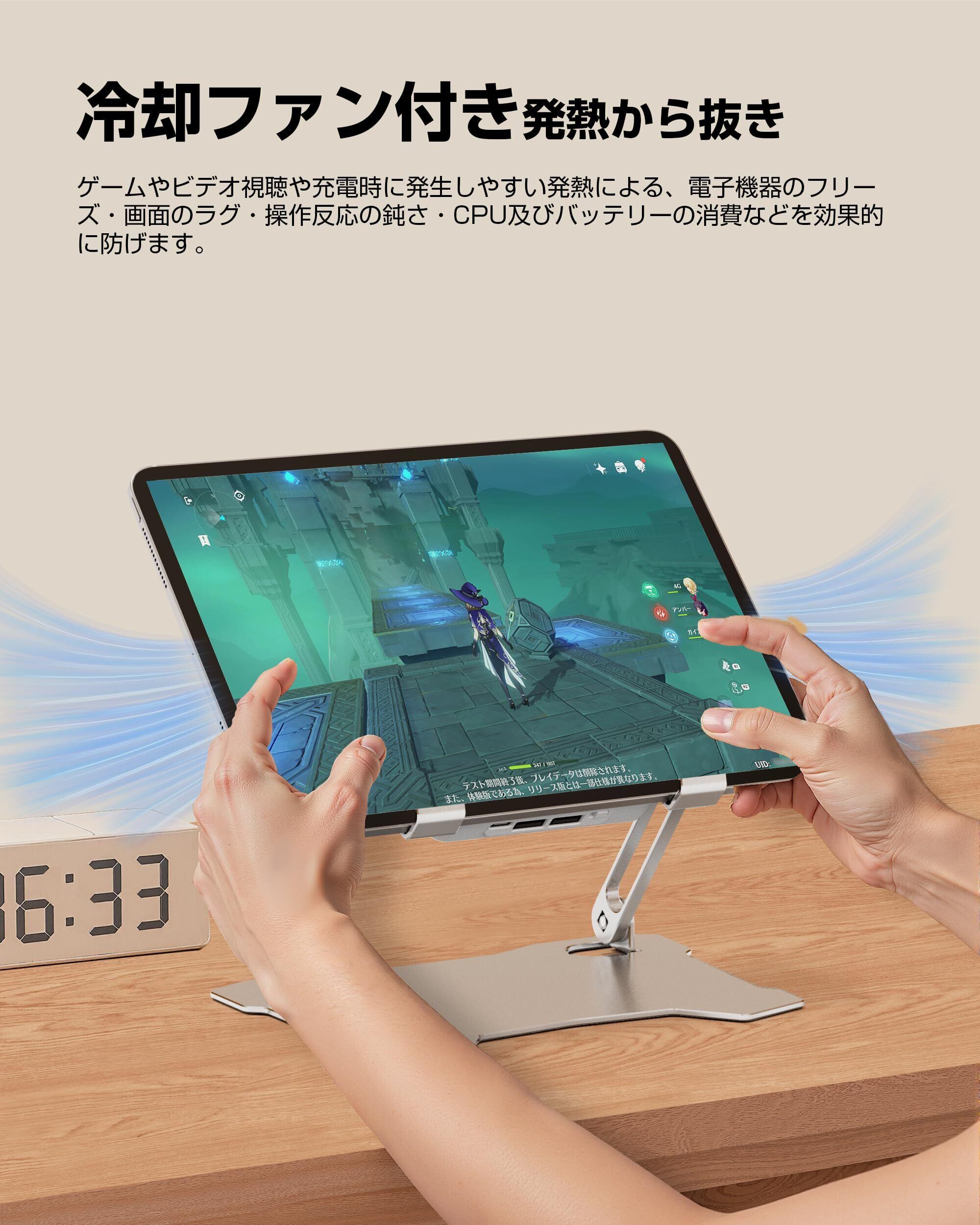 【2022最新】タブレット 冷却スタンド iPad 冷却ファン アルミ合金製 mac mini(m4)冷却台 四つファン付き 2つUSBポート付き 折りたたみ 低騒音 角度調整 人間工学設計 姿勢改善 滑り止め付き ゲーム/絵描き用 iPad Pro,mini,Air 7.9-13インチタブレット対応