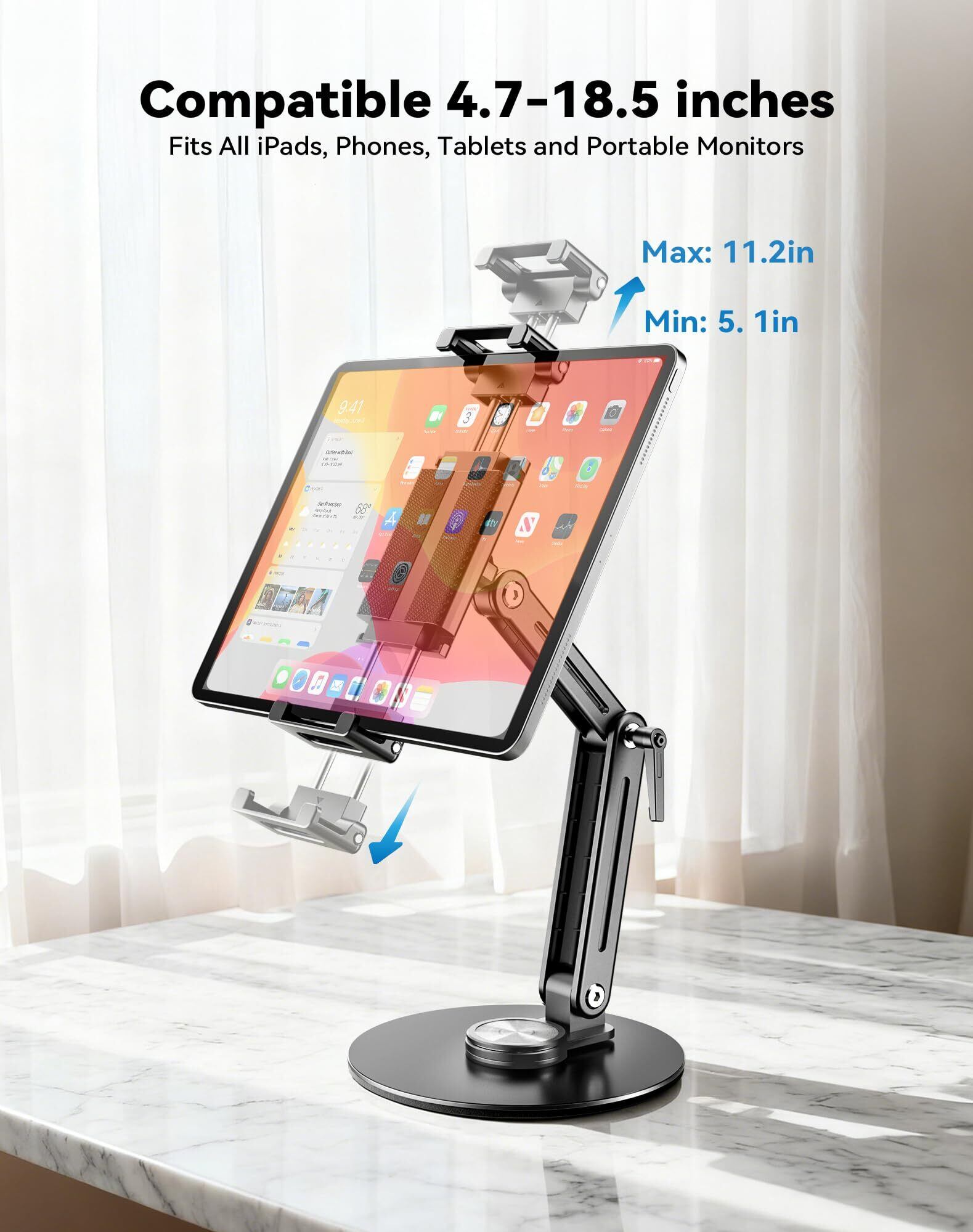 【広範囲互換&高安定性】このタブレットスタンド 卓上は 4.7~18.5 インチのデバイスに広く対応し、ベースとタブレットアームが増厚設計となっているため、安定性に優れています。