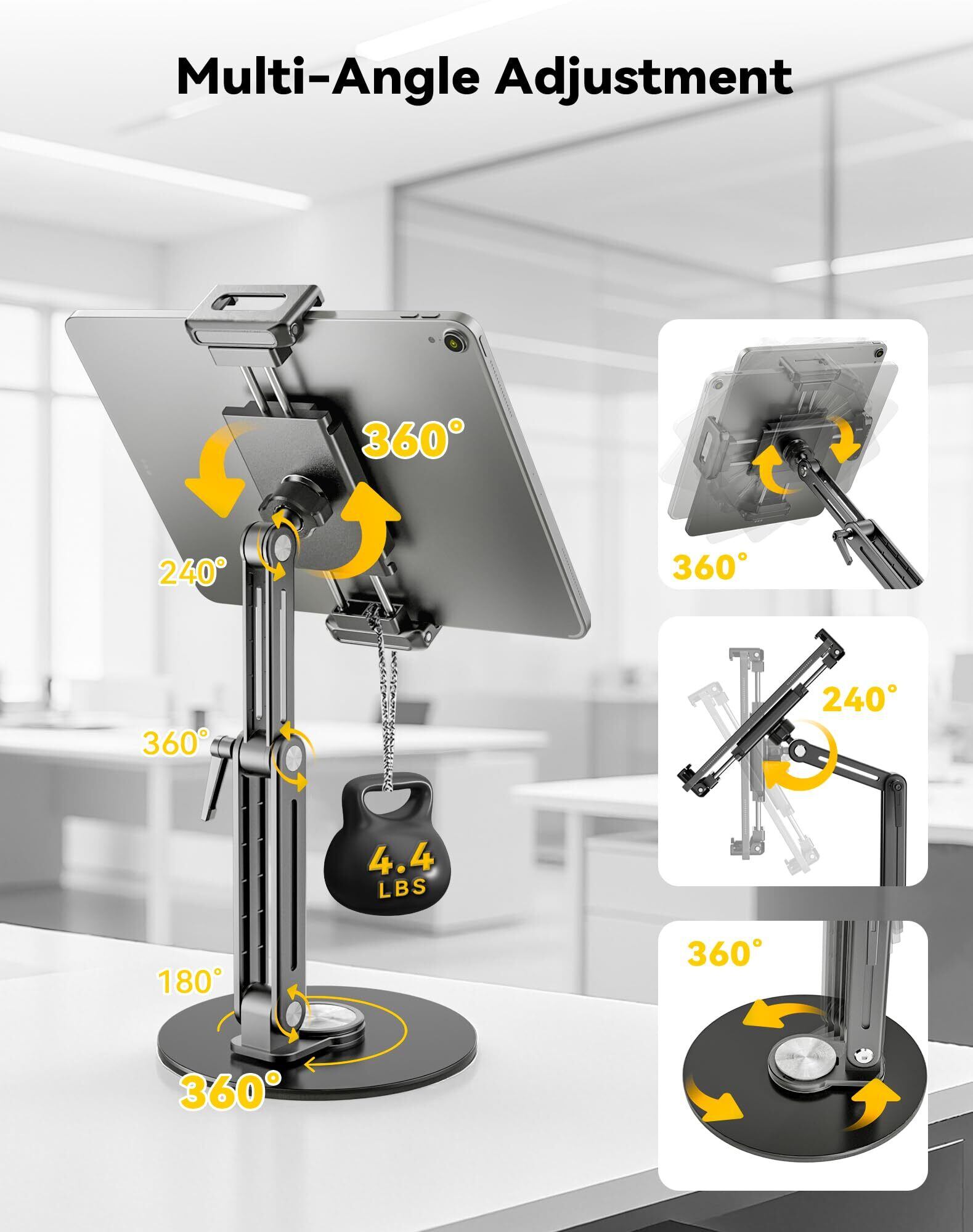 【高耐荷重&多角度調整】このiPad スタンドの耐荷重は最大 4.4LBS で、多角度調整に対応し且つ工具が同梱されており、高さ調整 タブレット スタンドとして快適な使用角度を簡単に見つけられます。