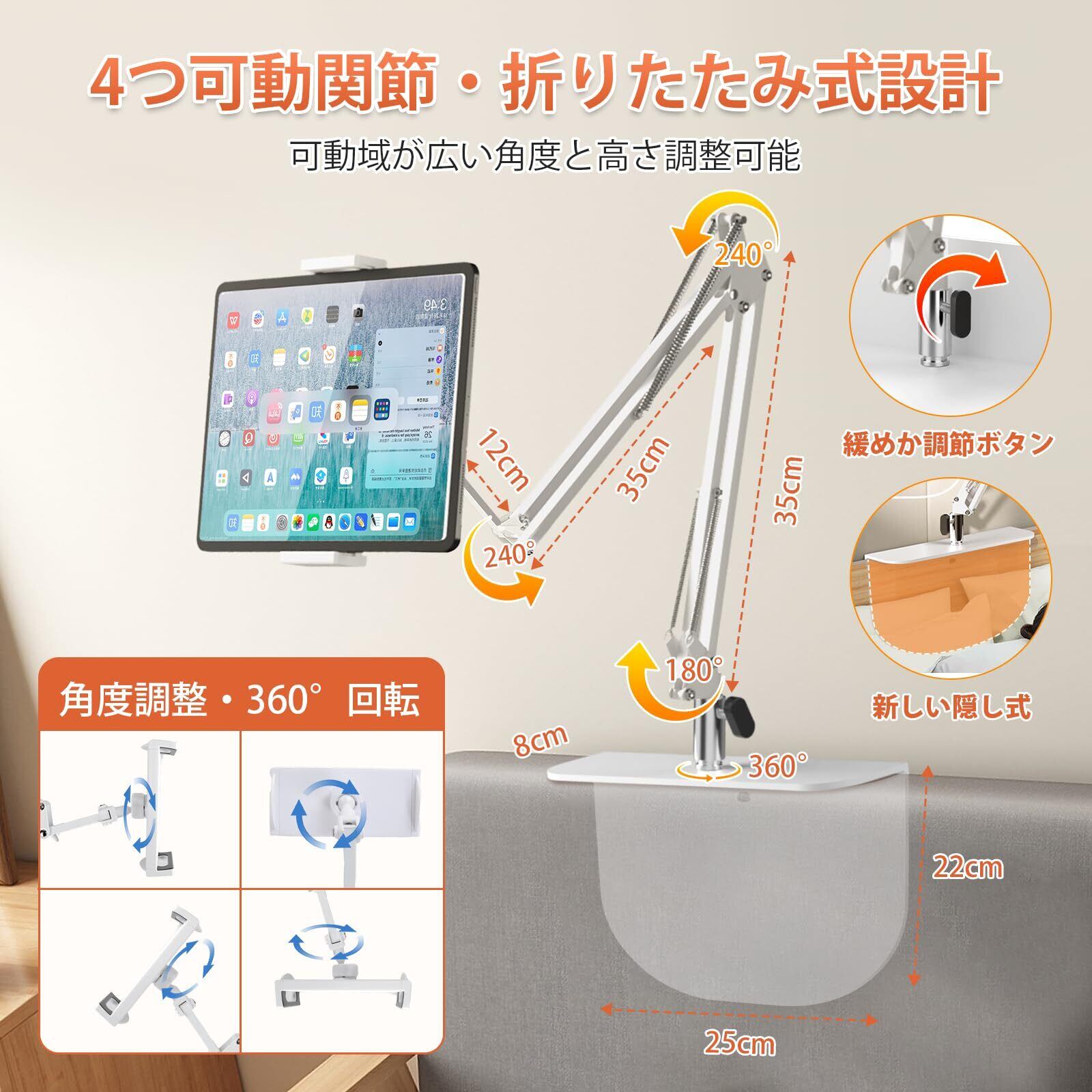 Panovolタブレットスタンド【2024革新型・隠し式台座・ケーブル固定具付き】 タブレット アーム スマホスタンド 寝ながら4つの関節 折り畳み式 角度+高さ自由調整 隠しベース取り付け簡単 卓上スタンド 360°回転ホルダー 【炭素鋼材質・安定性UP】 省スペース横/縱/仰向け 滑り止め ipad スタンド 寝ながら読書 4-12.9インチiPad/iPhoneに対応 白