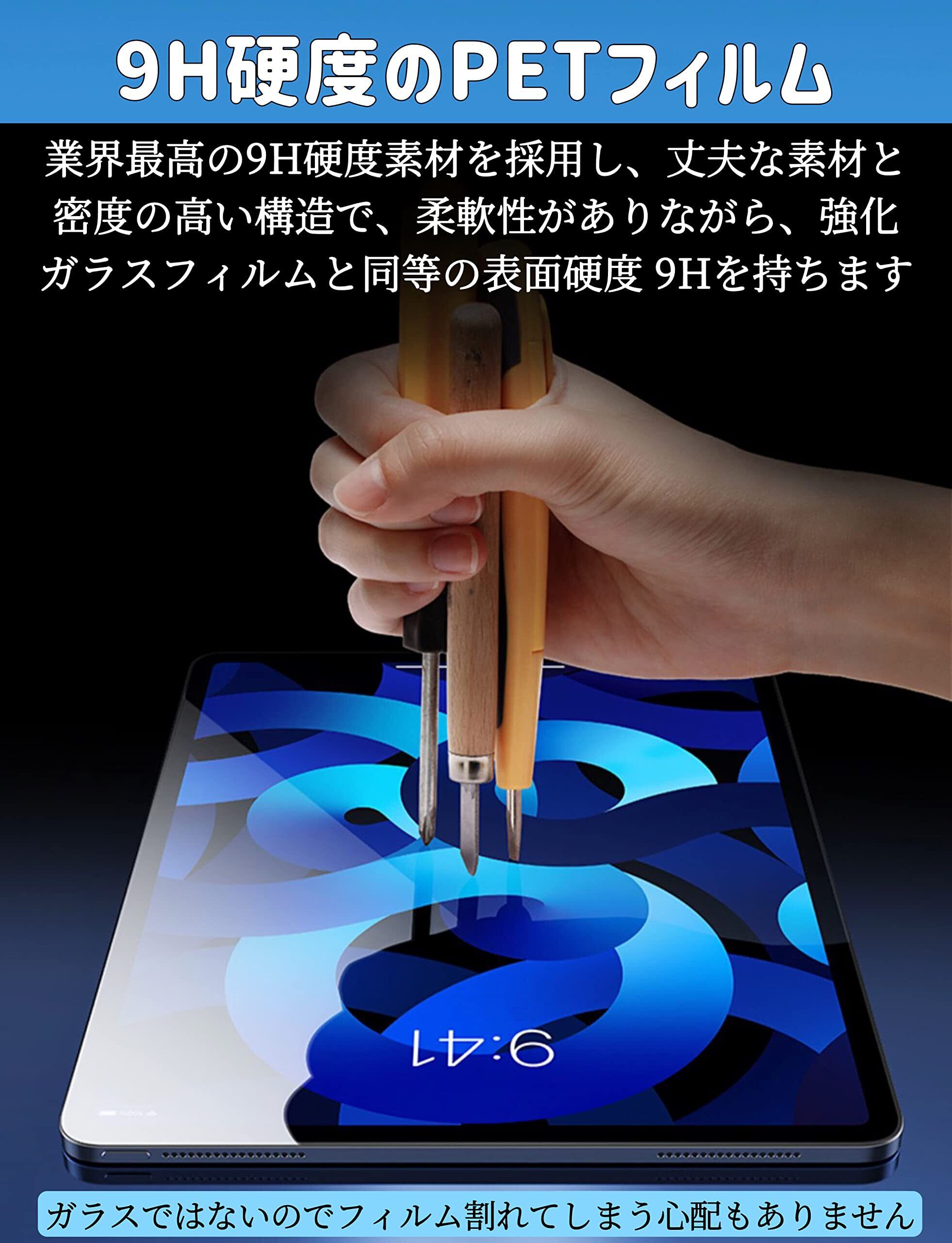 9H硬度:9Hのハードコート加工でディスプレイをしっかりガードします。指紋防止 :フィルム表面の指紋防止加工により指紋や汚れが残りにくくなります。水や汚れ、油分をはじくため布などを用いて拭き取るだけで、画面をきれいな状態に保ちます