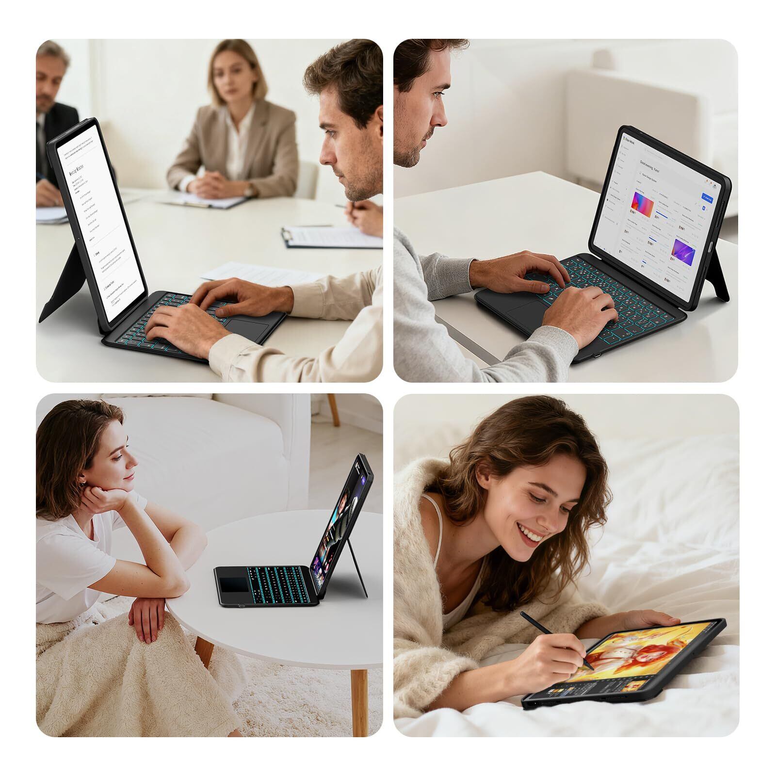 【縦置きでも横置きでも使用可能】キーボードは横向きでも縦向きでもスマートに接続でき、背面スタンドは 170° まで調整可能で、見やすい位置にスムーズに角度調整できます。タイピング、動画視聴、会議などに最適です。また、キーボードを使用しない時は簡単に取り外すことができます。