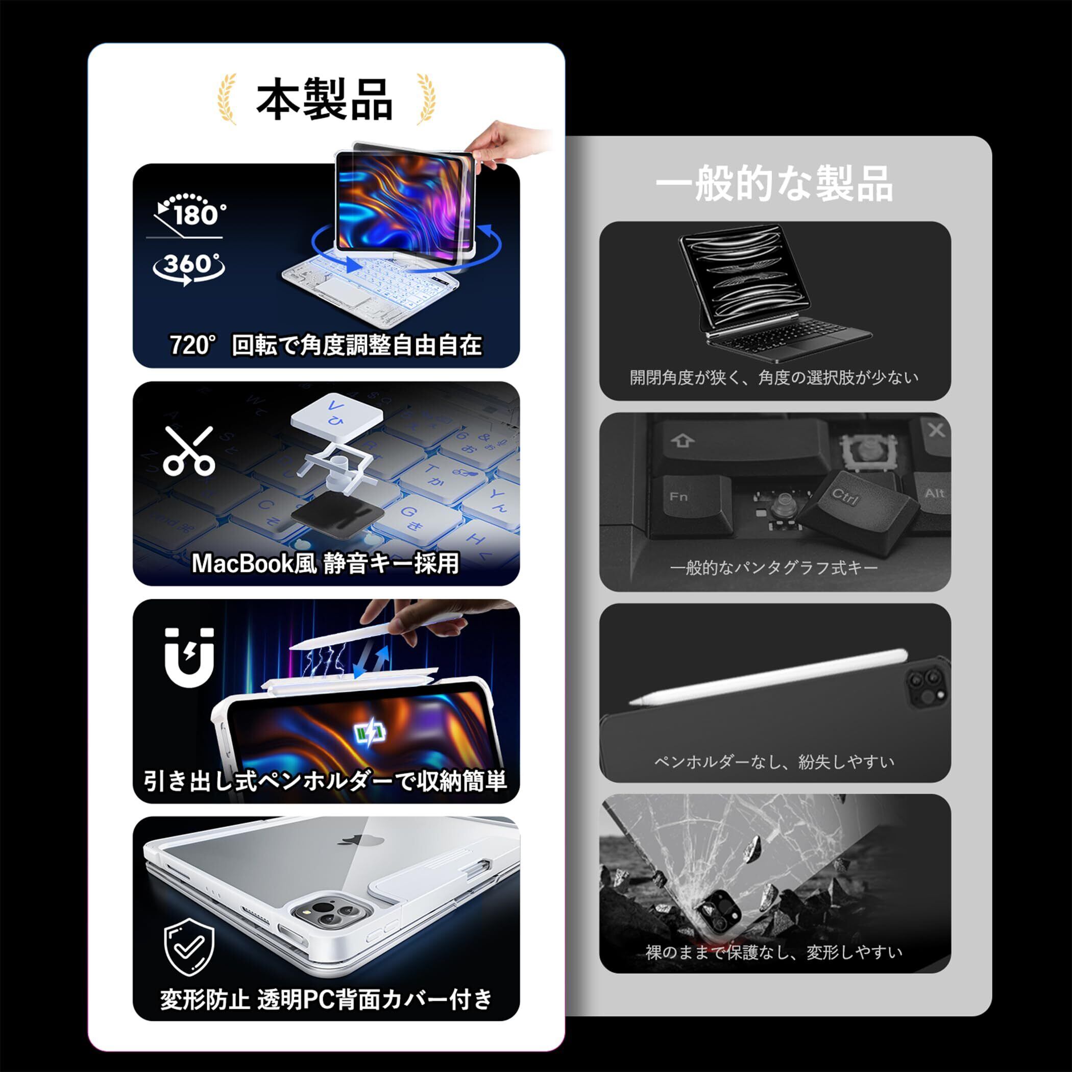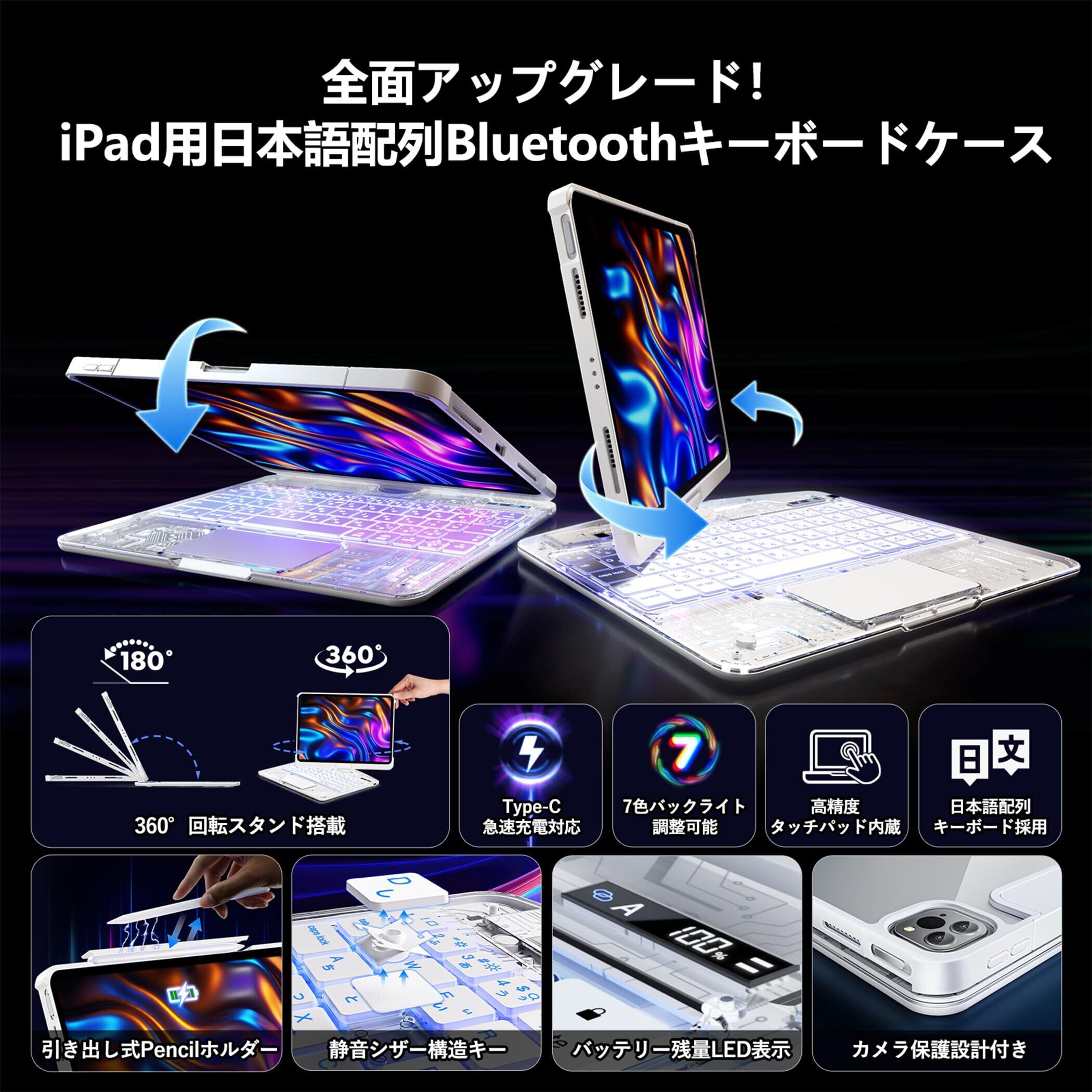 【新着商品】ipad Air 11インチ 第4/5/6/7世代 キーボードケース 対応【360度回転式】アイパッド キーボード付きケース 超高精度トラックパッド搭載・Bluetooth5.3・7色バックライト・JIS日本語配列 薄型 Magic Keyboard風カバー 透明ホフイト(iPad Air 第4/5/6/7世代 11インチ)