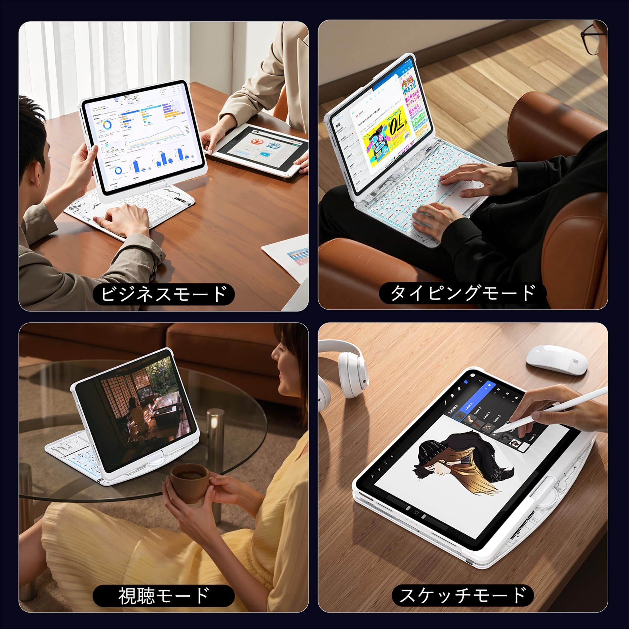 【360度回転スタンド|横・自由自在】 業界初の360°回転ヒンジ構造を採用。動画視聴・資料閲覧・Zoom会議・漫画読書など、横向きをスムーズに切替可能。自由なアングル調整で、iPad キーボード付きケースとして最高の操作性を実現。