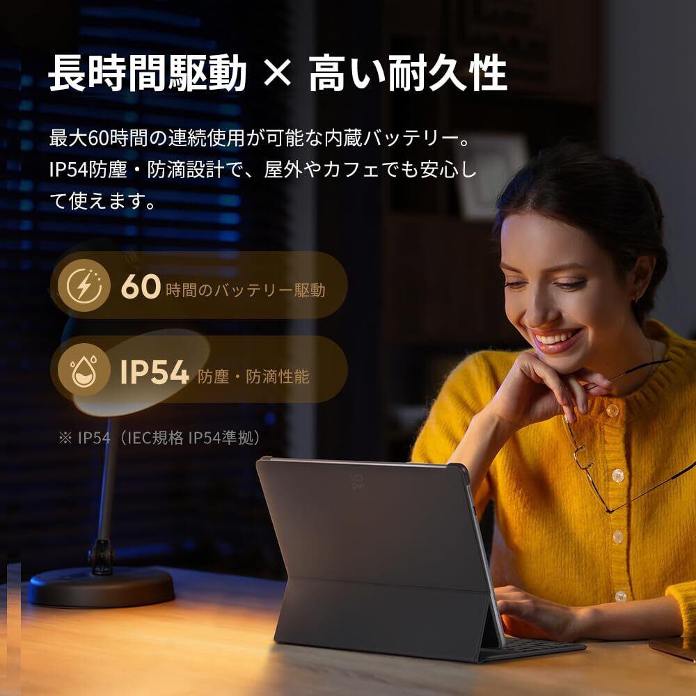 4. 【驚異の長時間駆動】最大60時間もの連続使用が可能な大容量バッテリーを搭載。何日も充電せずに使用できます。また、IP54規格の防塵・防滴設計により、ちょっとした水滴や埃から守るので、様々な環境で安心してお使いいただけます。