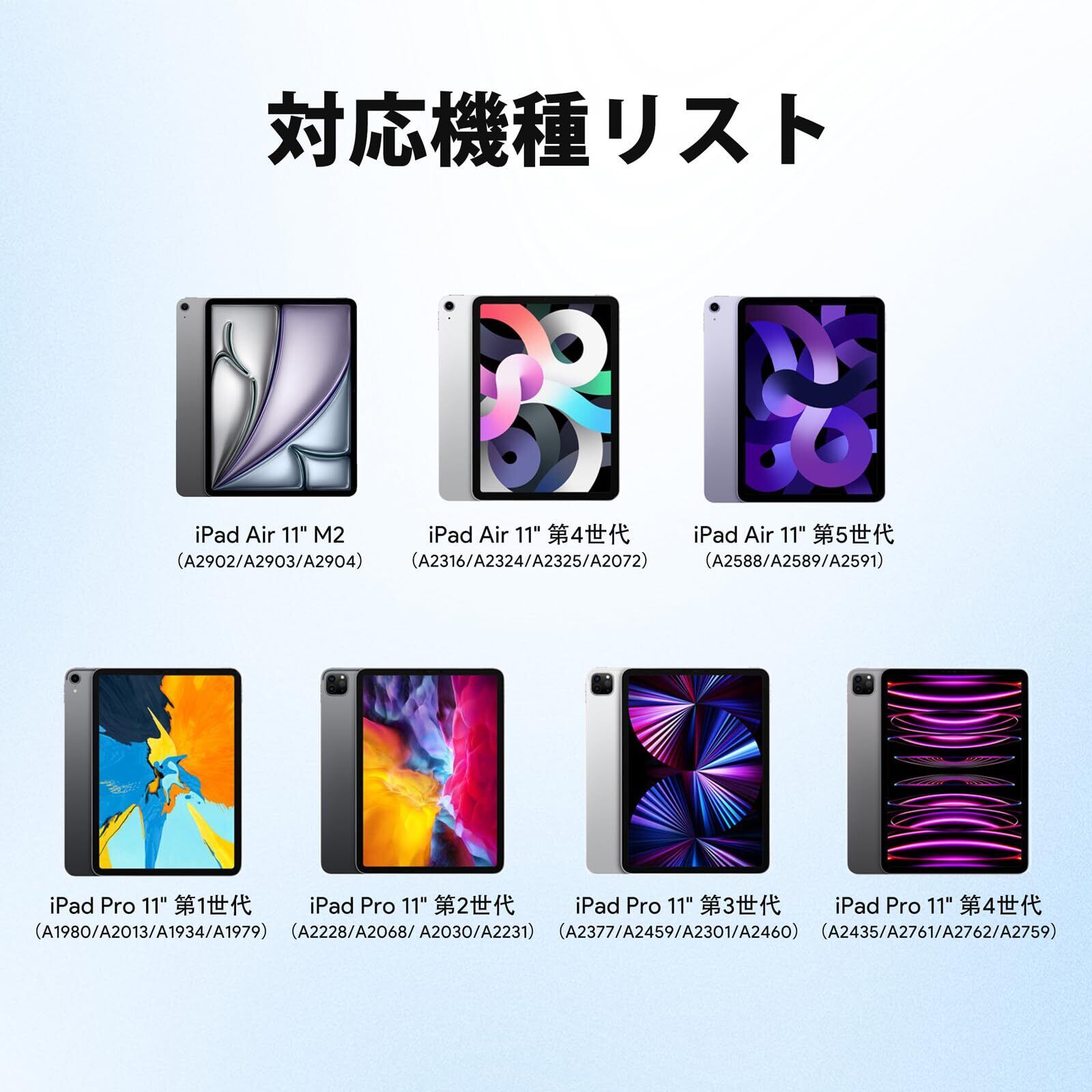 【対応機種】iPad Air 11インチ(第4/5世代)およびiPad Pro 11インチ(第1/2/3/4世代)に対応した保護ケース付きキーボードです。これらのiPadモデルに完璧にフィットし、あらゆる状況での使用をサポートします。