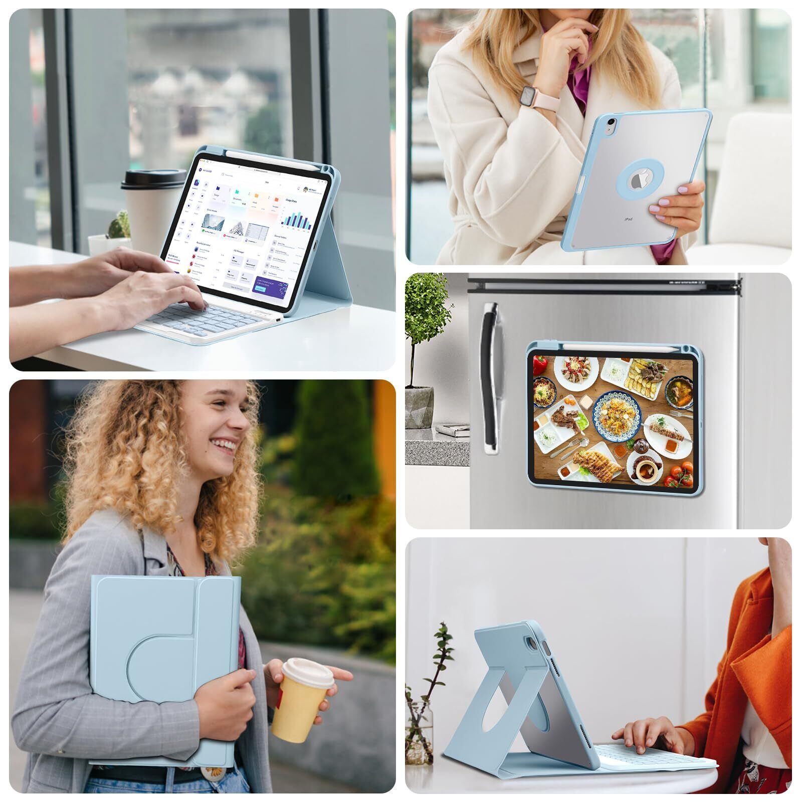 ✦✦【iPad Air 6 360°回転ケース】Bettdow磁気回転ケースは横向きと縦向きで回転するように設計されており、様々なシーンに対応します。 ケースの外側には指紋が付きにくい丈夫なレザーを使用し、内側は柔らかい衝撃吸収TPU素材を採用し、キーボードやiPadを安全に守ります。